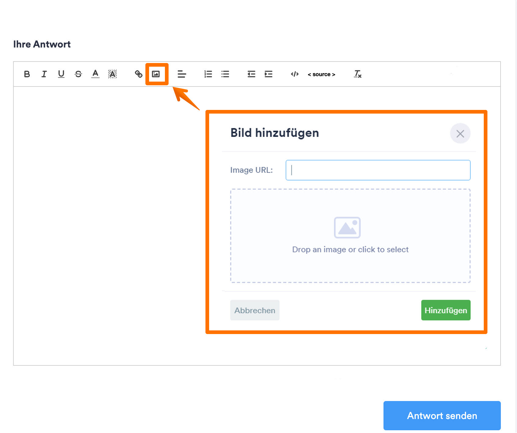 - Hier antworten Sie. Klicken Sie auf Bild einfügen.