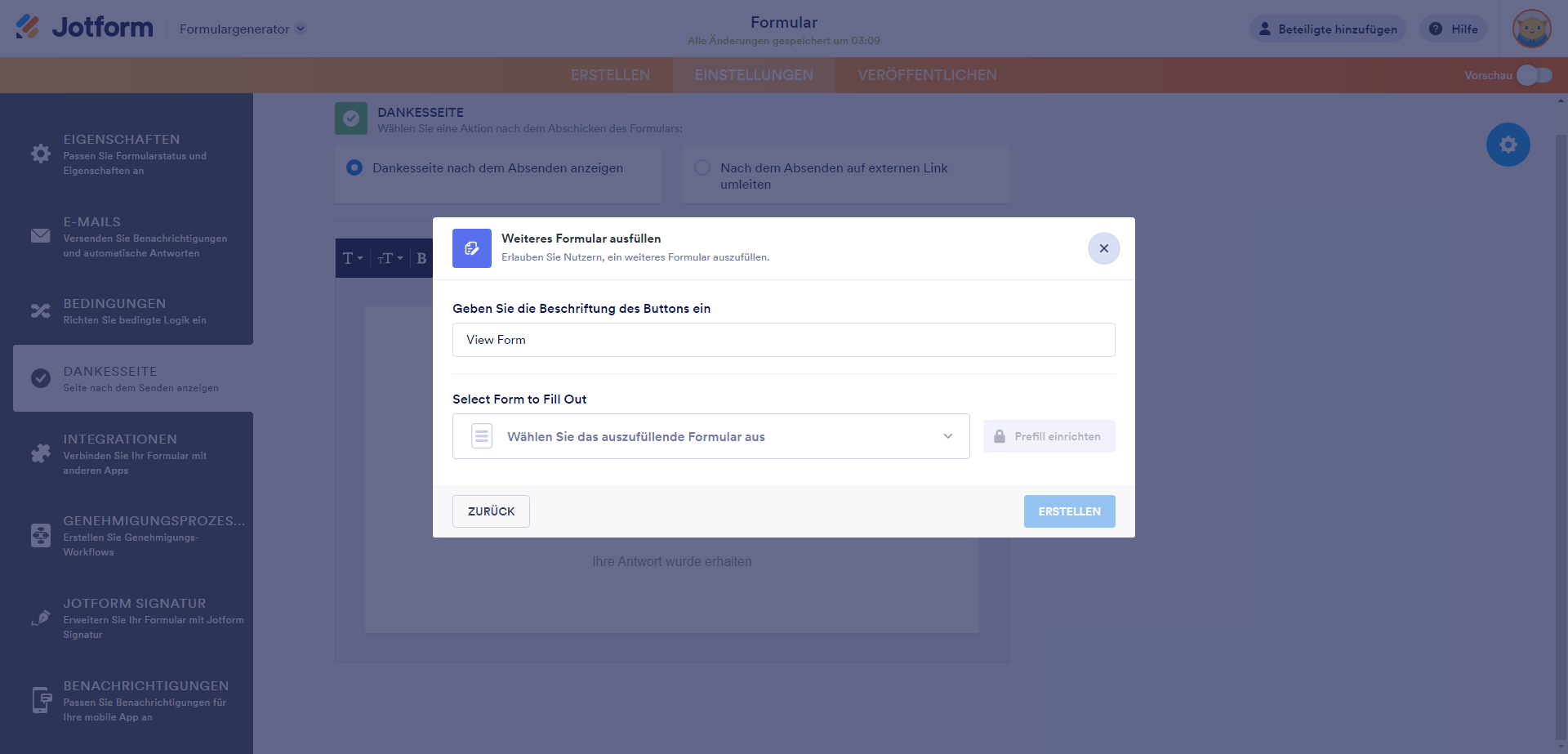 Mit der Option Weiteres Formular ausfüllen können Nutzer ein weiteres Formular aus Ihrem Konto ausfüllen. Sie können in dieser Option auch eine Vorausfüllung einrichten, sodass Nutzer das andere Formular mit denselben Daten ausfüllen, die sie im Hauptformular eingegeben haben. Wählen Sie die Option aus und gehen Sie wie folgt vor: