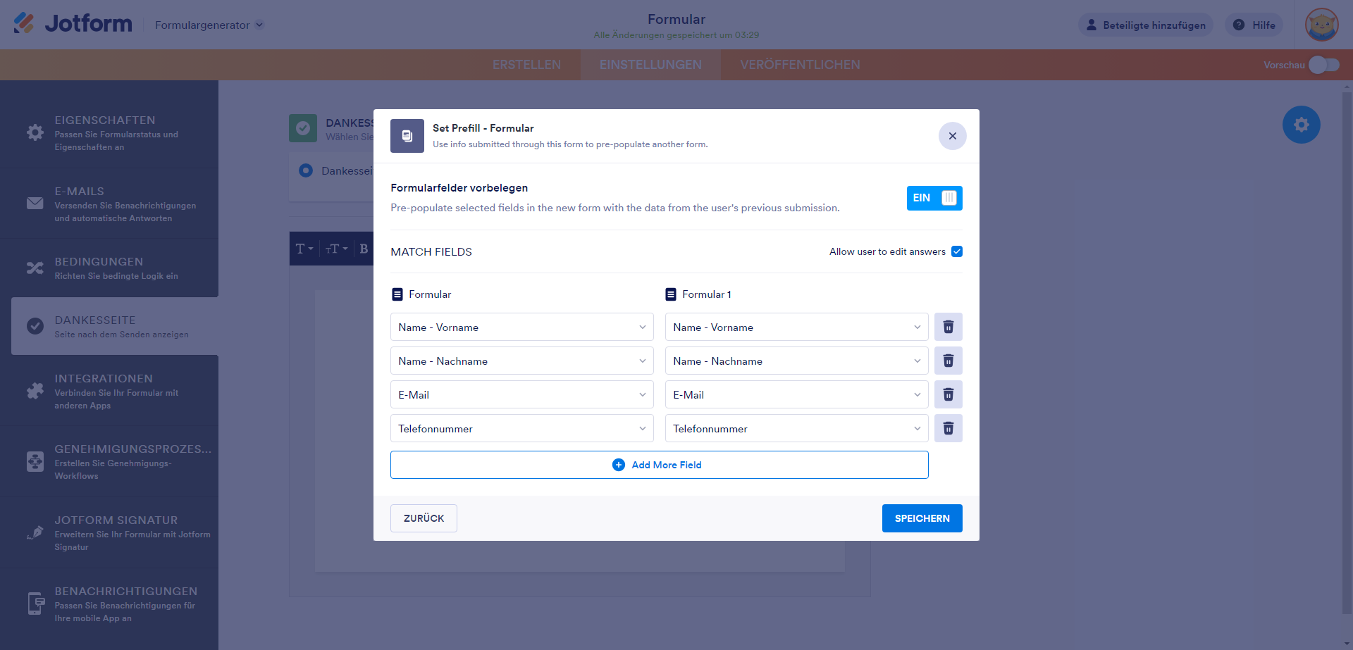 - Wählen Sie die Formularfelder aus, die vorausgefüllt werden sollen.