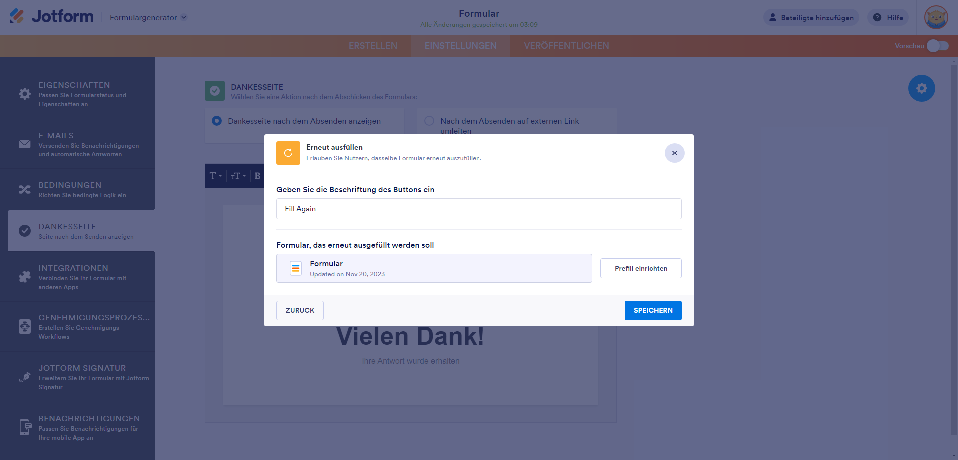 Die Option Erneut ausfüllen ermöglicht es Benutzern, dasselbe Formular erneut auszufüllen. Sie können in dieser Option die Vorausfüllung aktivieren, sodass Benutzer das Formular mit denselben Daten, die sie bereits übermittelt haben, erneut ausfüllen können. Wählen Sie die Option aus und gehen Sie wie folgt vor:
