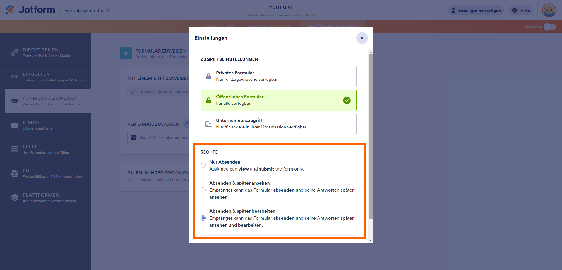 - Später absenden & bearbeiten – Wenn Sie diese Berechtigung wählen, können Ihre Beauftragten das Formular absenden und ihre Formularantworten jederzeit einsehen und bearbeiten.