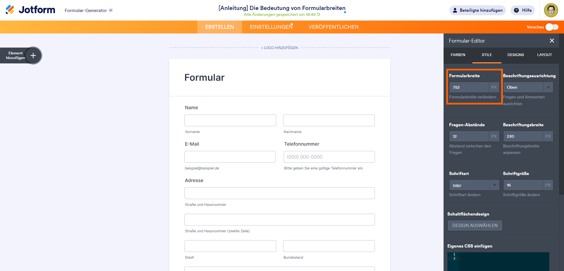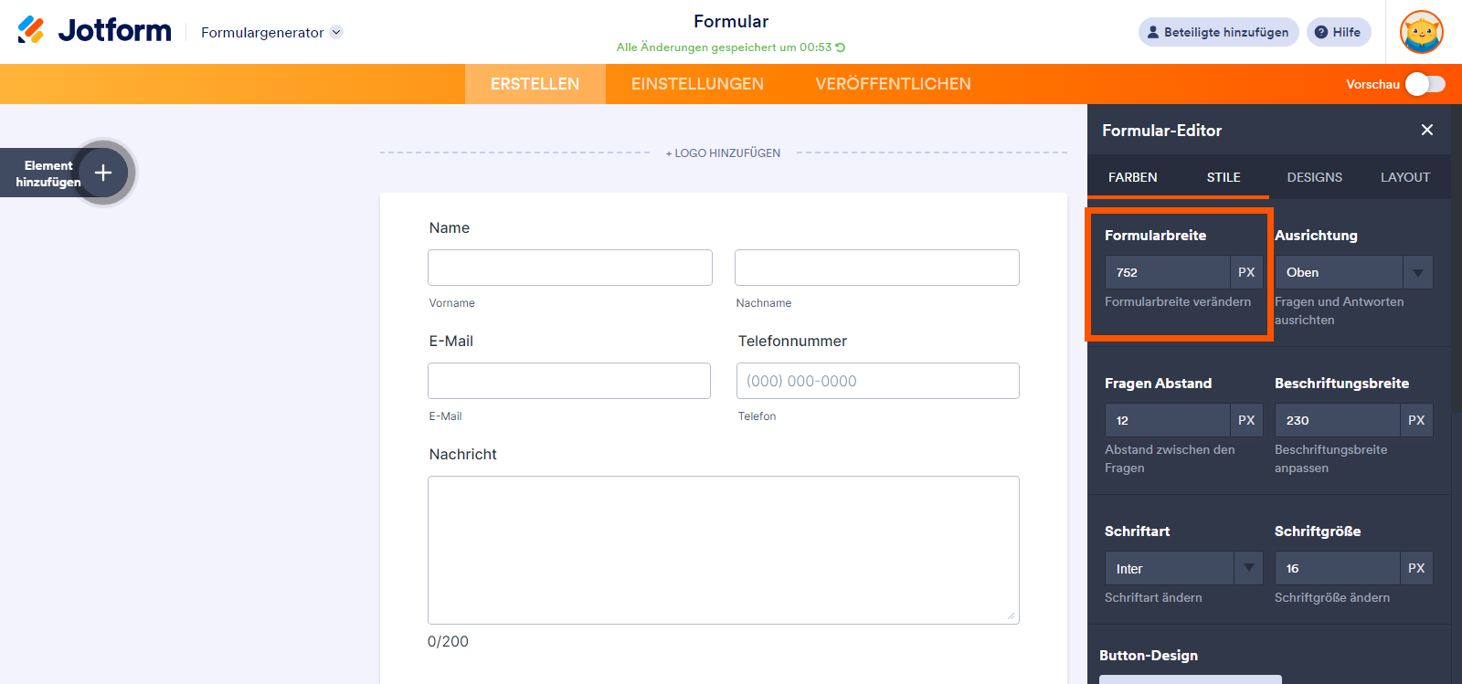 Und das war’s. So können Sie die Formularbreite ändern. Die Änderungen werden automatisch gespeichert.