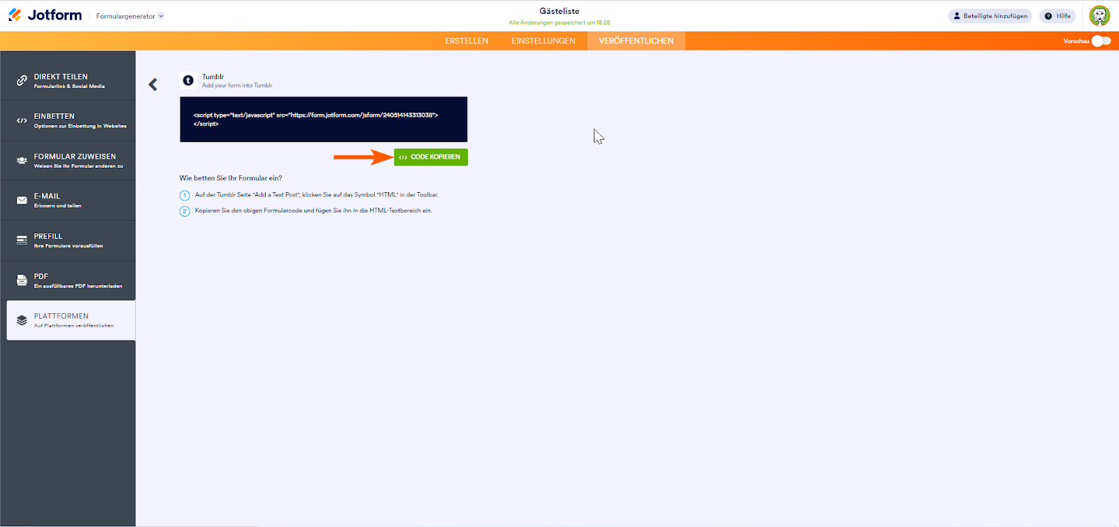 - Gehen Sie im Formular-Generator auf die Registerkarte Veröffentlichen.