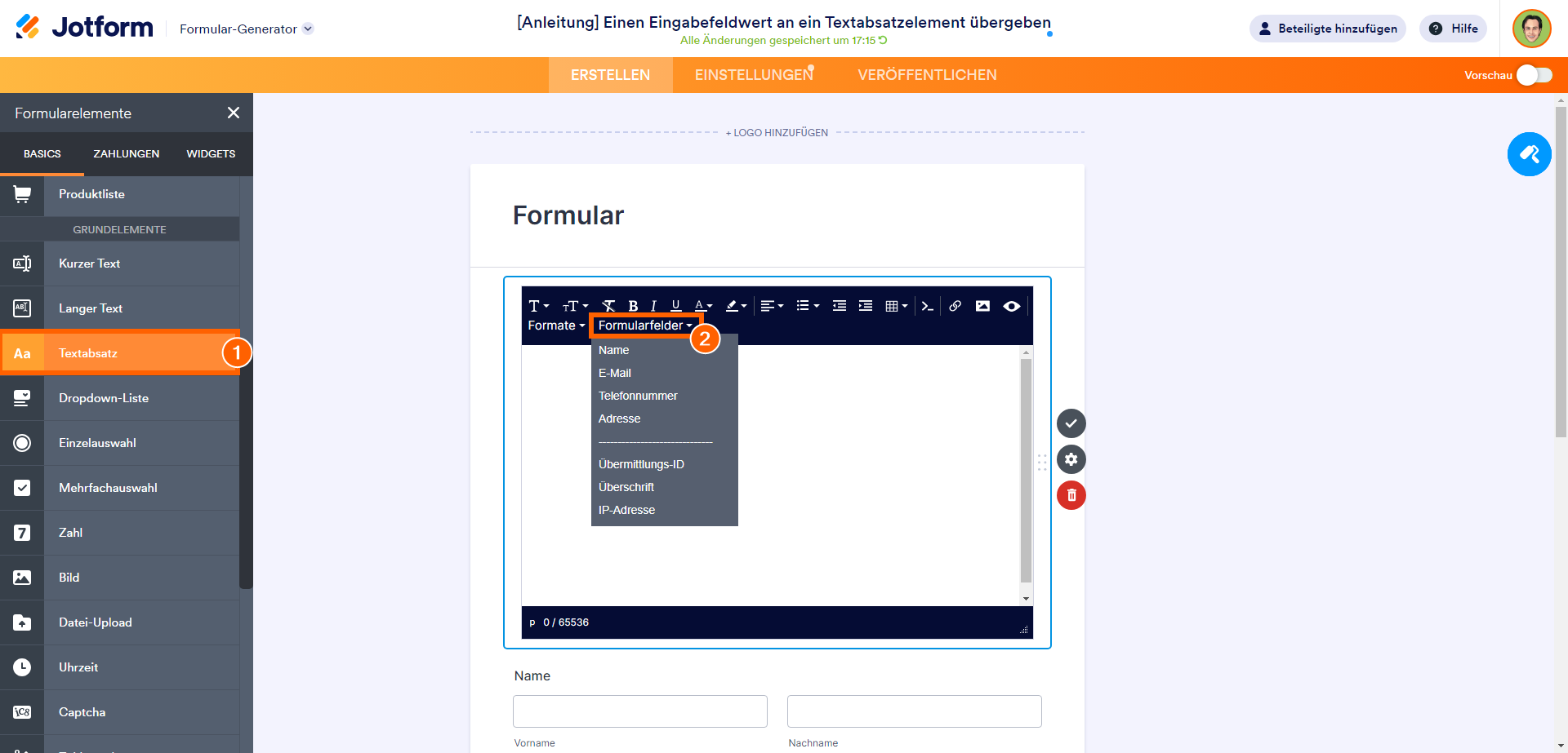 - Klicken Sie im Menü Formularelemente unter dem Reiter Grundlegend auf das Element Absatz. Oder ziehen Sie es einfach per Drag & Drop an die gewünschte Stelle in Ihrem Formular.