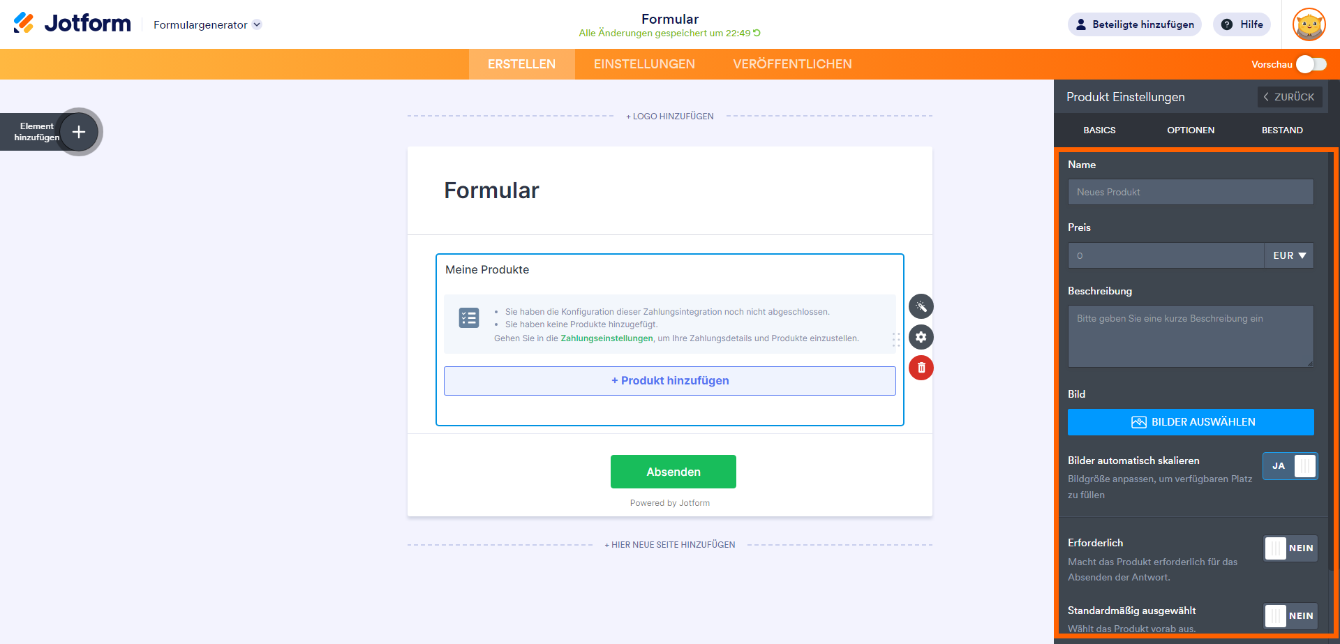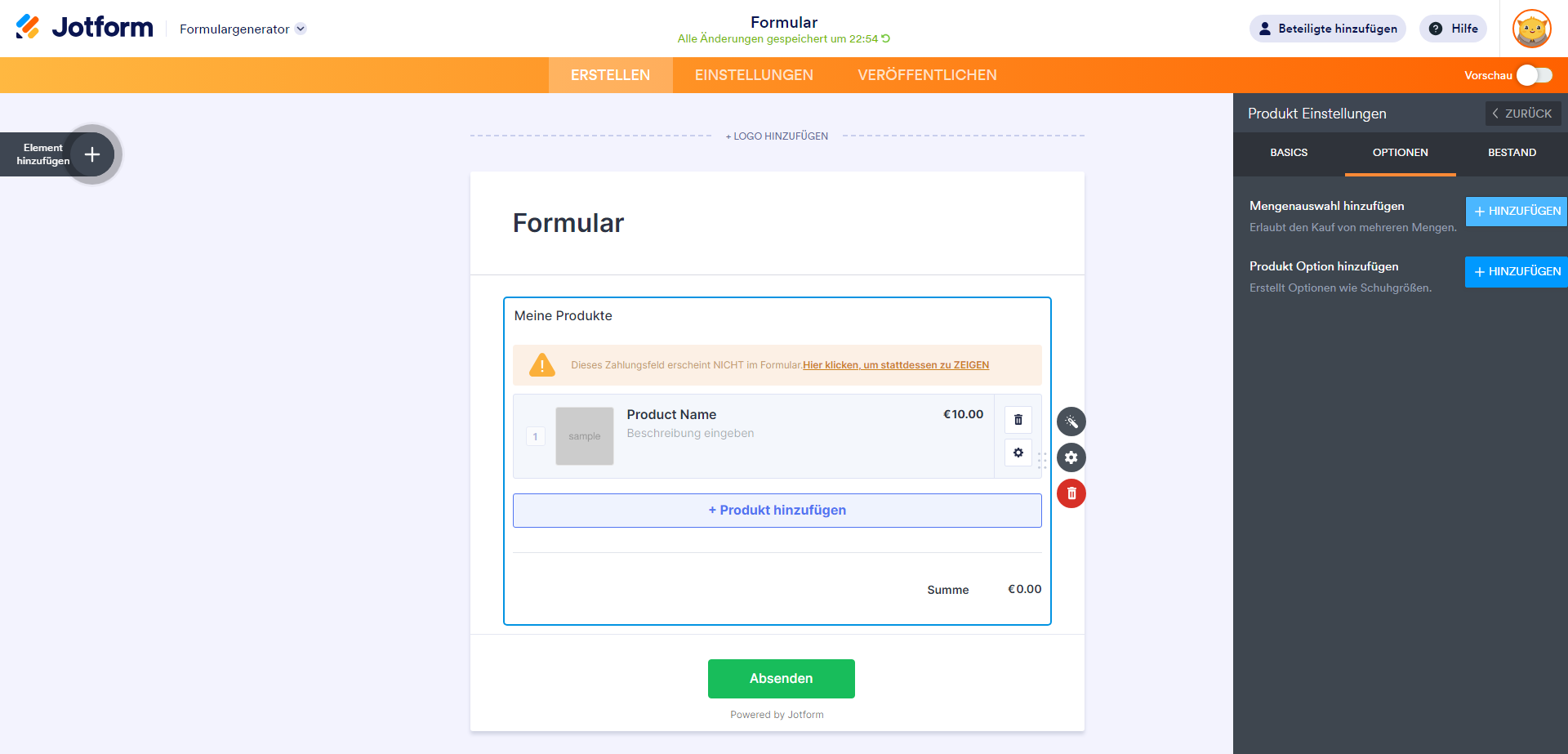 Hinzufügen und Einrichten des Zahlungselements