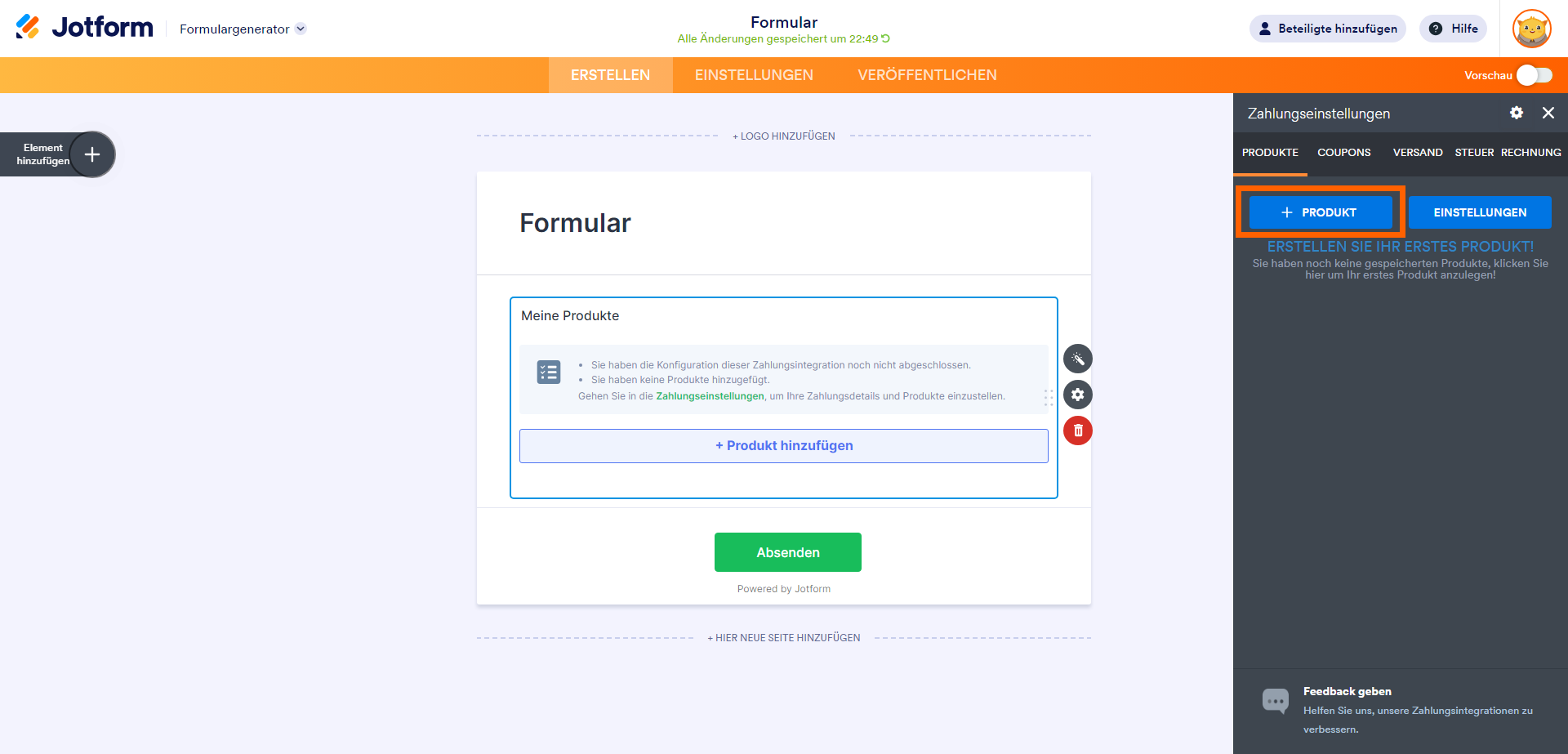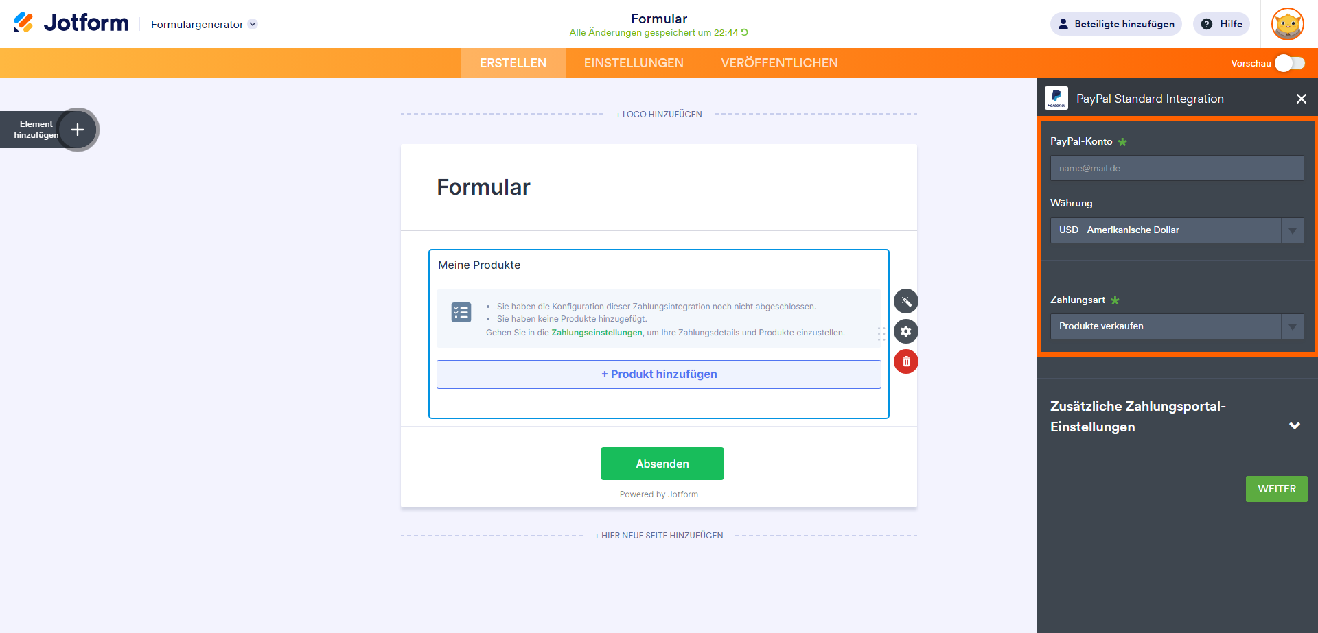 Nachdem Sie die Zahlungseinstellungen vorgenommen haben, gelangen Sie mit der Schaltfläche Weiter zum Tab Produkte. Fügen Sie Ihre Produktartikel wie unten beschrieben hinzu und richten Sie sie ein: