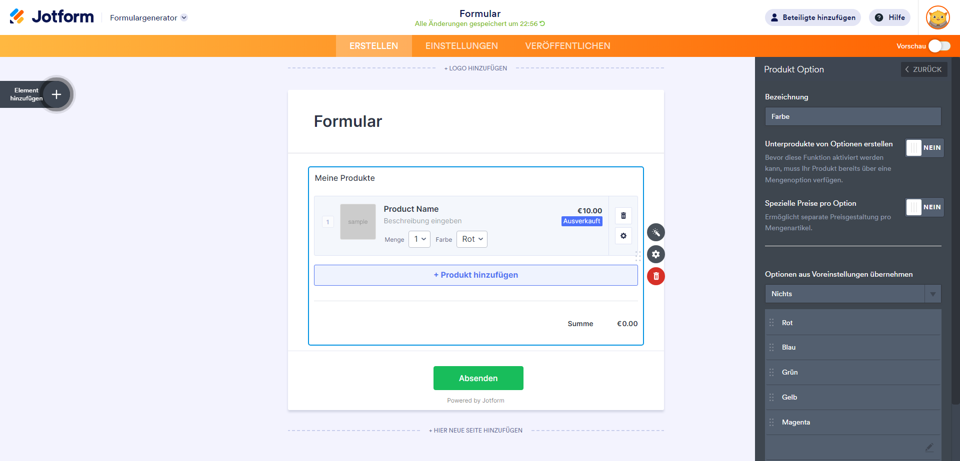 Beim Hinzufügen einer Produktoption können Sie Folgendes festlegen: