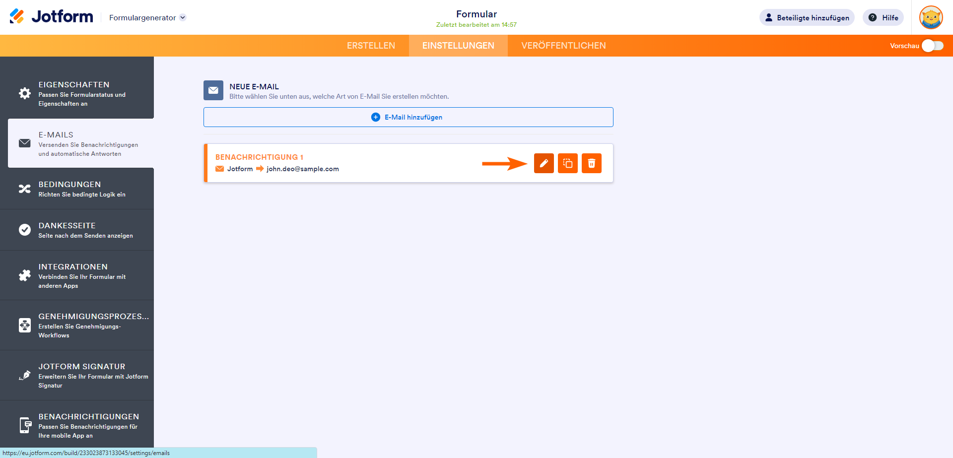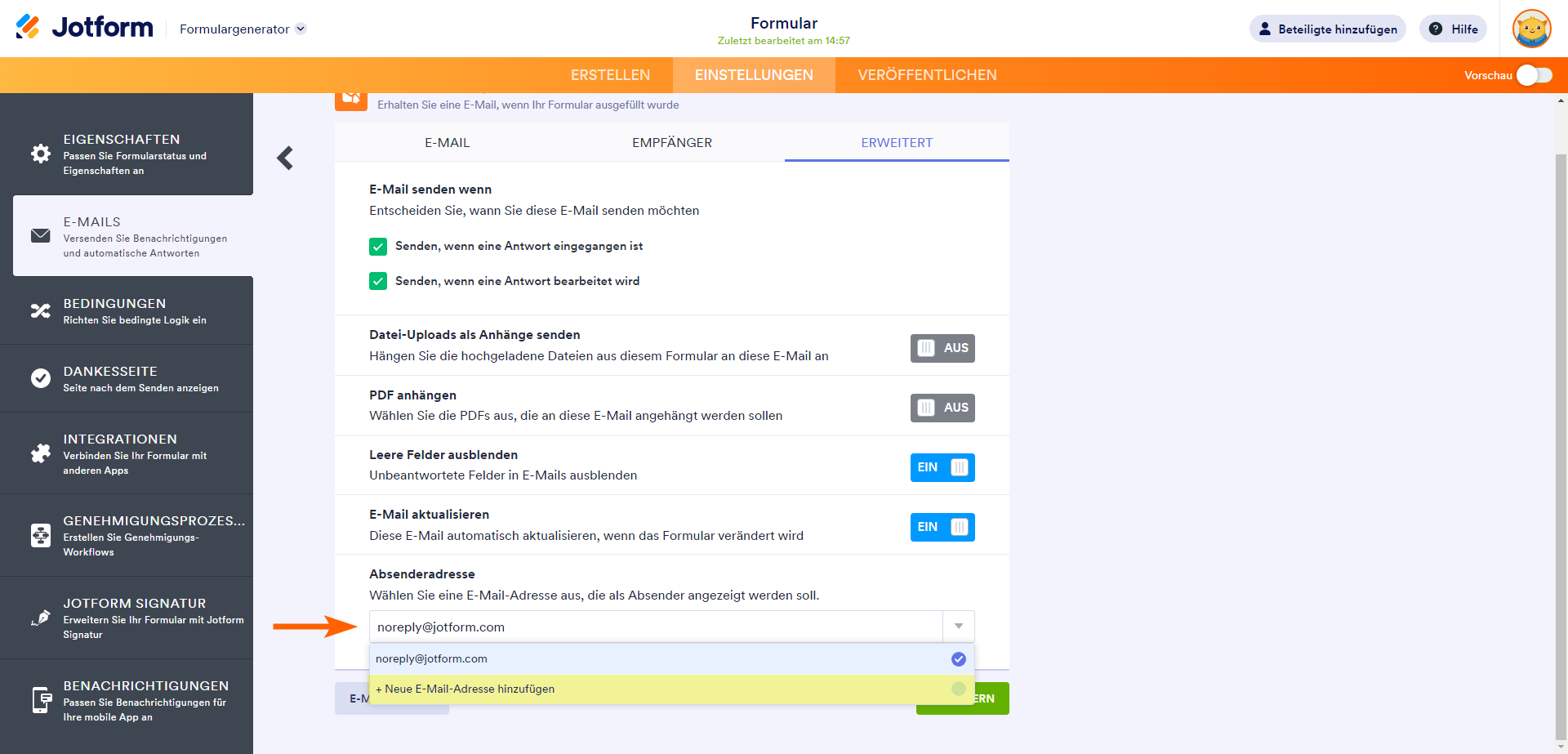 1. Klicken Sie auf den E-Mails Button im Formular Generator.