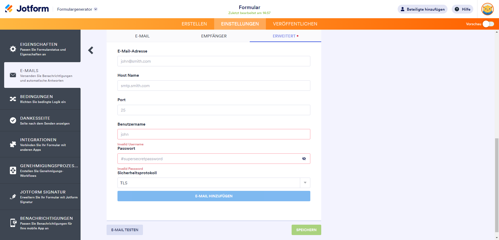 Klicken Sie auf den Button E-Mail hinzufügen oder auf den Button Speichern, um die benutzerdefinierten SMTP-Einstellungen zu speichern.