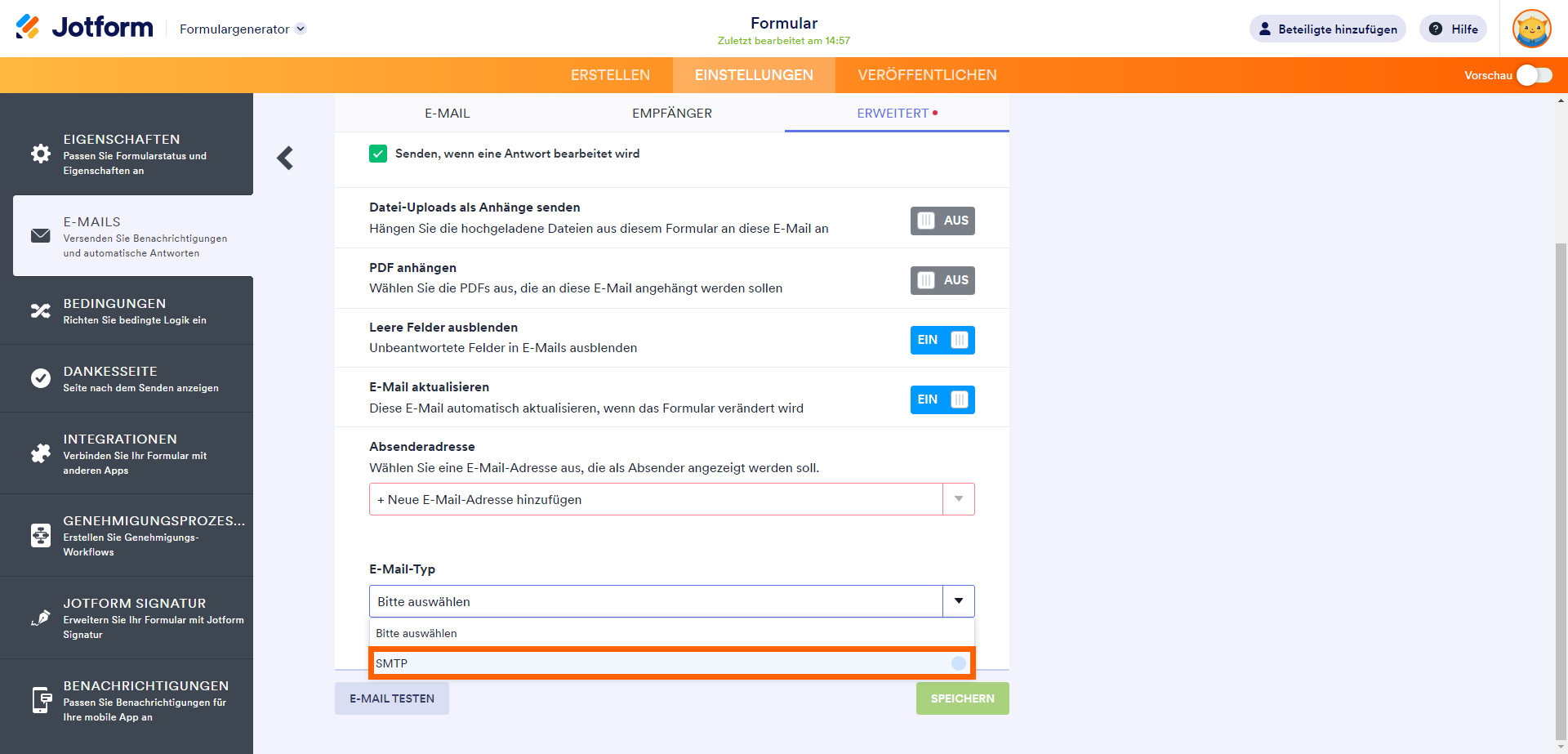 5. Wählen Sie unter E-Mail-Typ die Option SMTP.