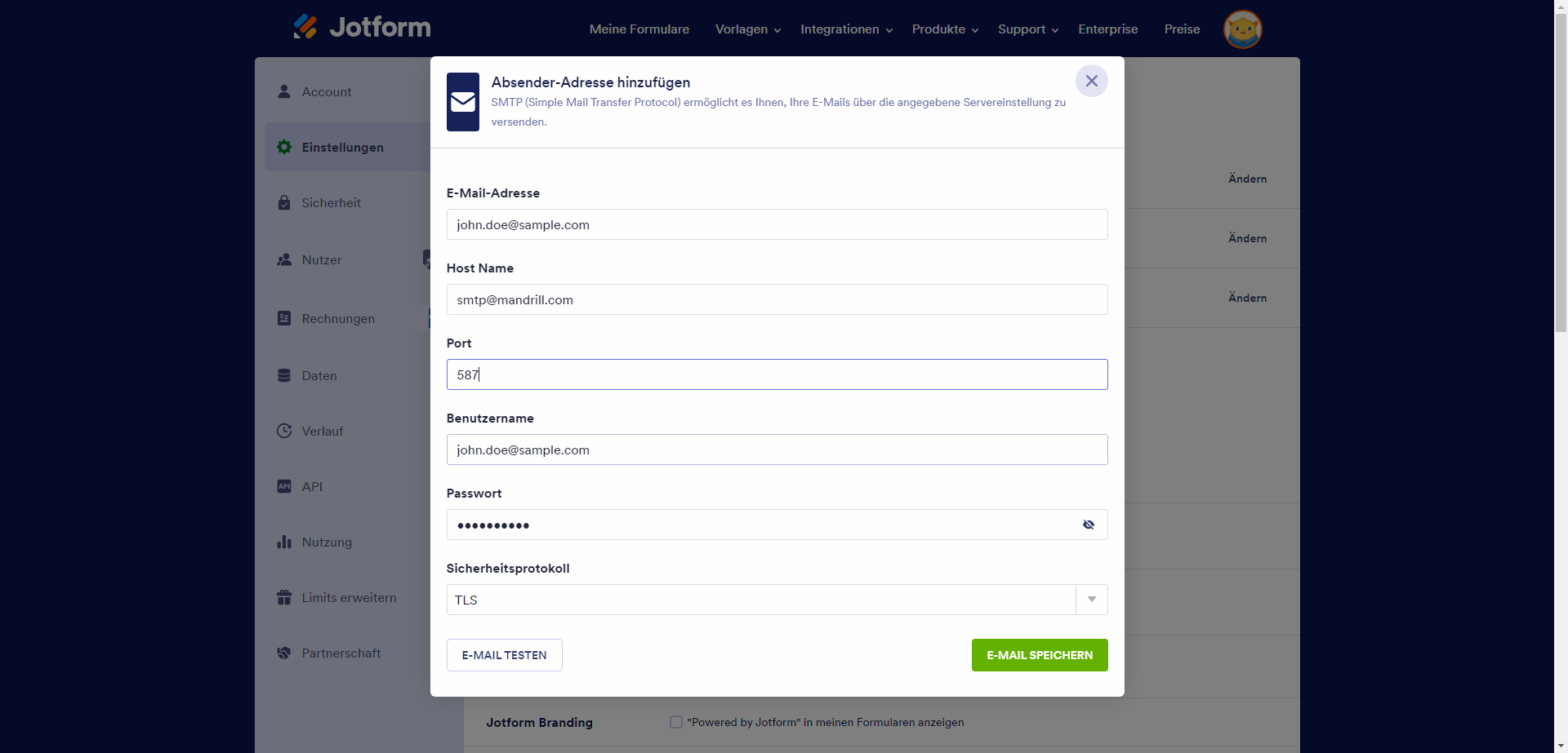 5. Geben Sie Ihre SMTP-Daten für Mandrill ein: