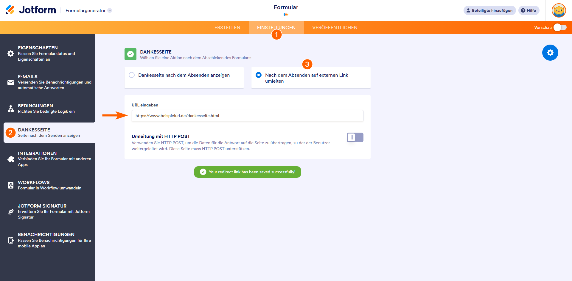 Durch die Anpassung Ihrer Danke-Seite können Sie Ihren Formularteilnehmern ein persönlicheres Erlebnis bieten. Eine automatische Weiterleitung sorgt dafür, dass die Teilnehmer nach dem Absenden des Formulars nahtlos zum nächsten Schritt weitergeleitet werden. Ob Weiterleitung zu einer bestimmten Webseite, einem anderen Formular oder zurück zum ursprünglichen Formular – diese Automatisierung optimiert das Nutzererlebnis.