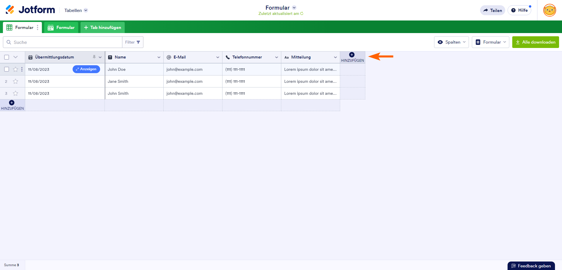 - In Jotform Tabellen können Sie eine neue Spalte hinzufügen oder einfügen. Weitere Informationen finden Sie unter Wie man Spalten hinzufügt und organisiert weitere Informationen finden Sie hier.