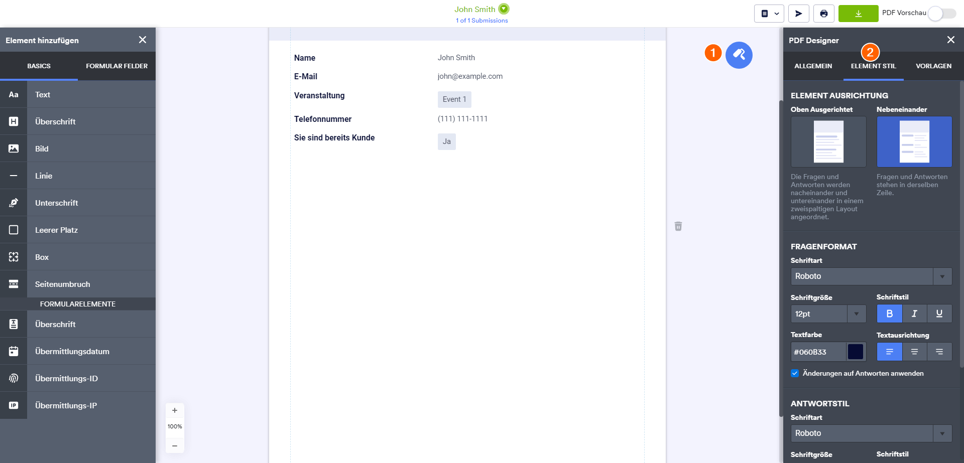 Ein PDF-Übermittlungsbericht ist ein herunterladbares PDF-Dokument, das die durch Ihre Formulareinreichungen erfassten Daten enthält. Sie können ihn zum Ausdrucken, Teilen von Informationen oder Anhängen an E-Mail-Benachrichtigungen verwenden. Mit dem PDF-Editor können Sie Layout und Inhalt des Dokuments individuell anpassen.