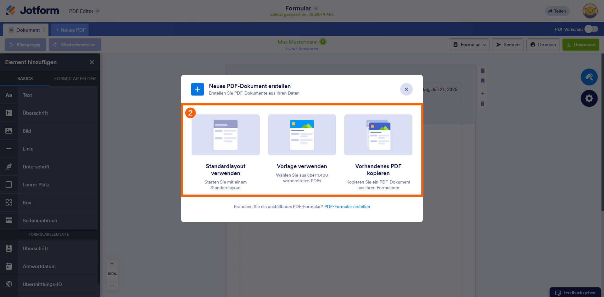 - Die Option PDF-Dokument erstellen erstellt ein neues PDF-Dokument für Ihre Formulareinreichungen und öffnet es im PDF-Editor in einem neuen Browser-Tab, damit Sie weiter daran arbeiten können. Die Option PDF-Editor öffnen öffnet lediglich ein vorhandenes PDF-Dokument, ohne ein neues zu erstellen.