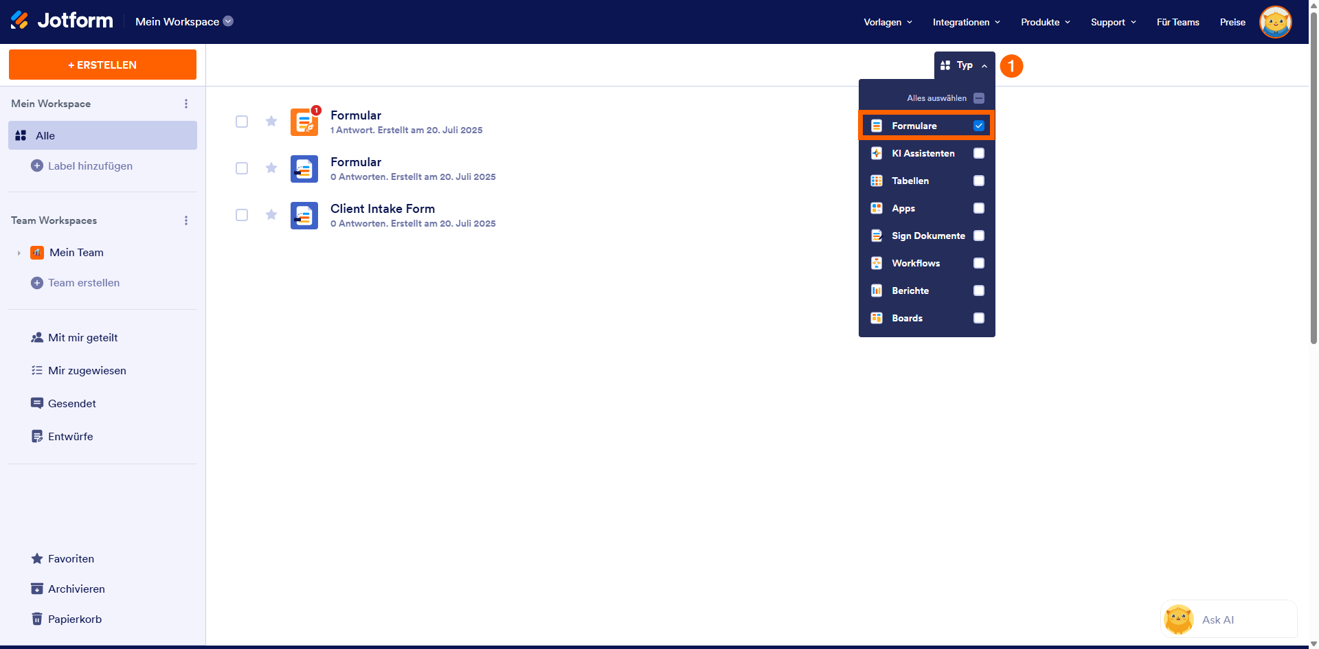- Klicken Sie auf Mein Arbeitsbereich oben auf Typ und deaktivieren Sie im sich öffnenden Dropdown-Menü die Kontrollkästchen neben allen Assets außer Formularen, sodass nur diese auf der Seite angezeigt werden.