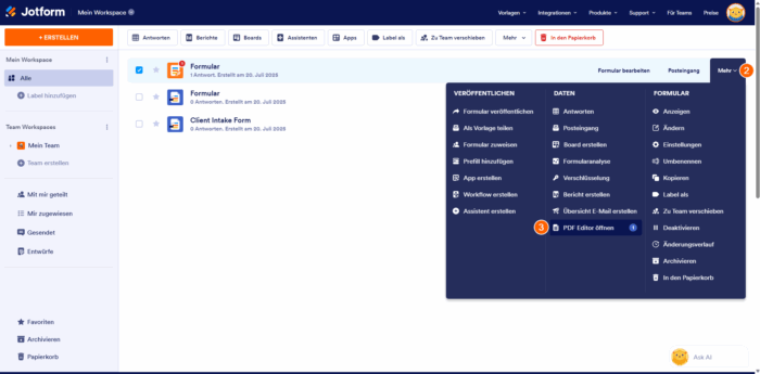 - Die Zahl neben der Option PDF-Editor öffnen im Menü Mehr des Formulars zeigt an, wie viele PDF-Dokumente für dieses Formular erstellt wurden.