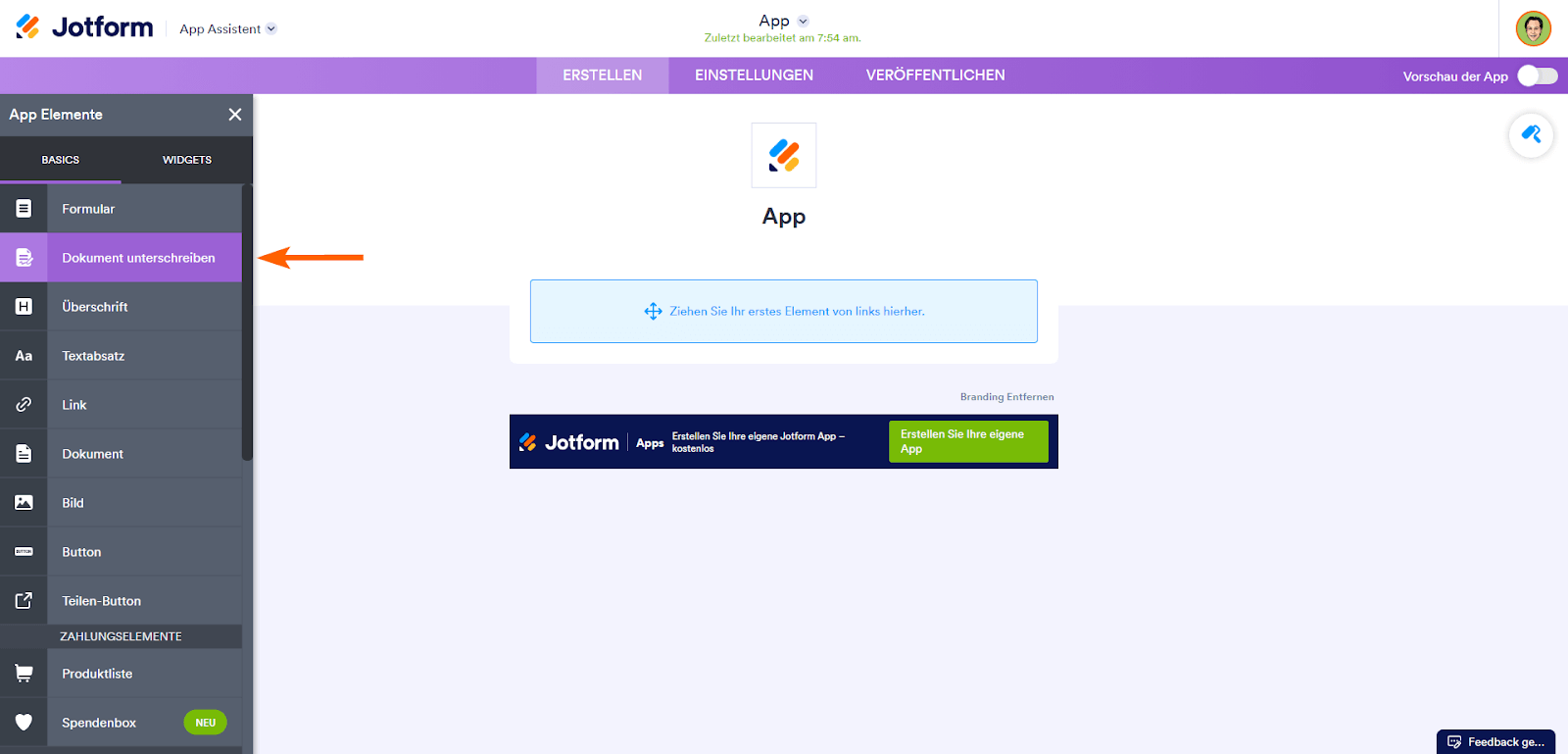 - Ziehen Sie im Reiter Allgemein per Drag & Drop ein Dokument Unterschreiben-Element in Ihren Jotform Generator.