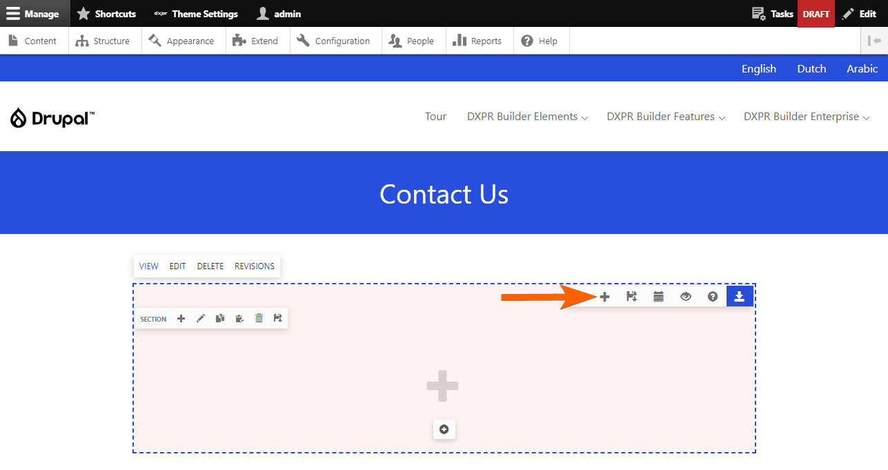 - Gehen Sie mit dem Mauszeiger zu dem Abschnitt, in dem Sie das Formular anzeigen möchten, und klicken Sie auf das Symbol Element hinzufügen (Plus).