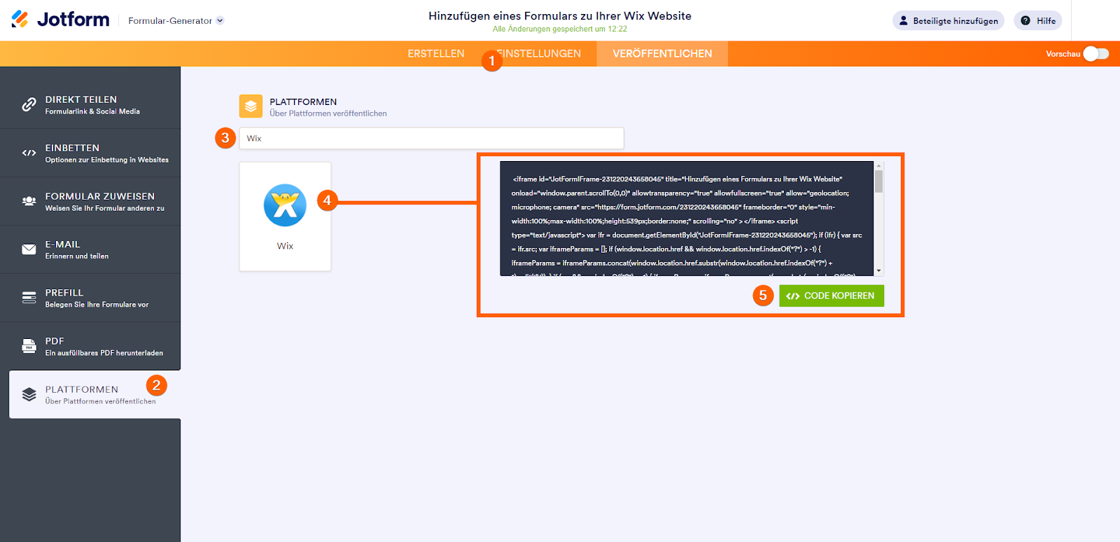 - Im Formular Generator wählen Sie oben Veröffentlichen