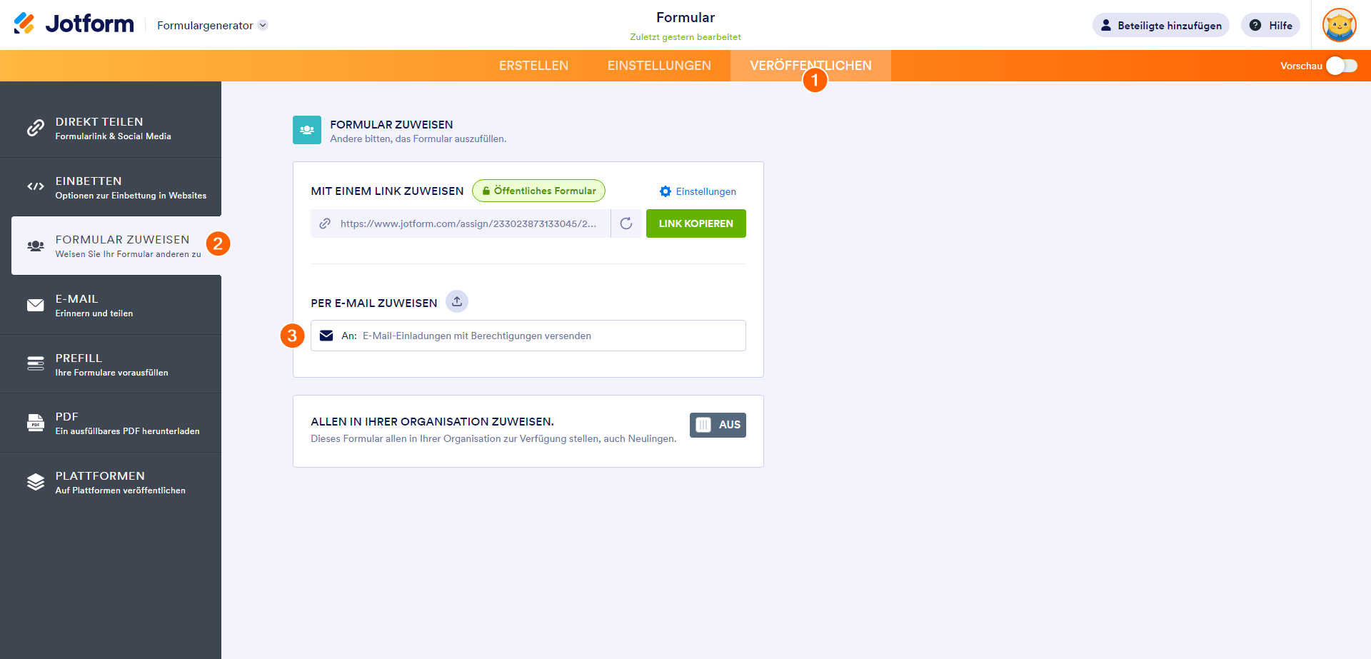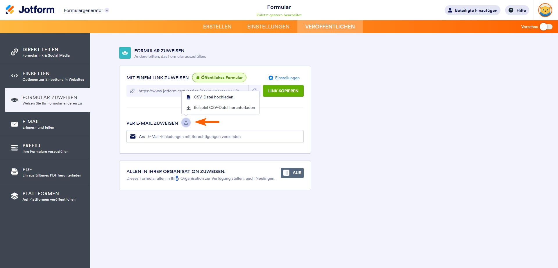 Jotform Enterprise-Nutzer können unten die Option Jedem in der Organisation zuweisen aktivieren, um das Formular allen Mitarbeitern in ihrem Unternehmen zur Verfügung zu stellen.