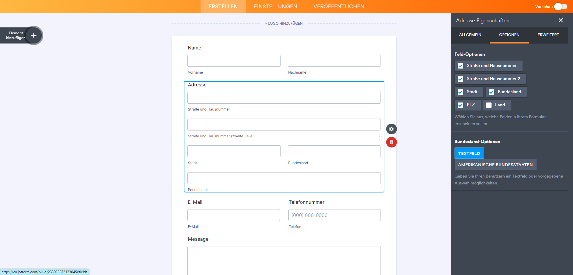 Die Verwendung des Adress-Elements anstelle separater Felder für Kurztext oder Langtext gewährleistet eine nahtlose Integration mit Salesforce und vereinfacht die Datenzuordnung und -synchronisierung erheblich. In den Adresseigenschaften können Sie auswählen, welche Adressbestandteile – wie Straße, Ort, Bundesland/Provinz, Postleitzahl und Land – je nach Bedarf angezeigt oder ausgeblendet werden sollen.