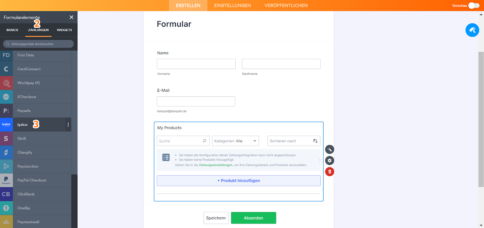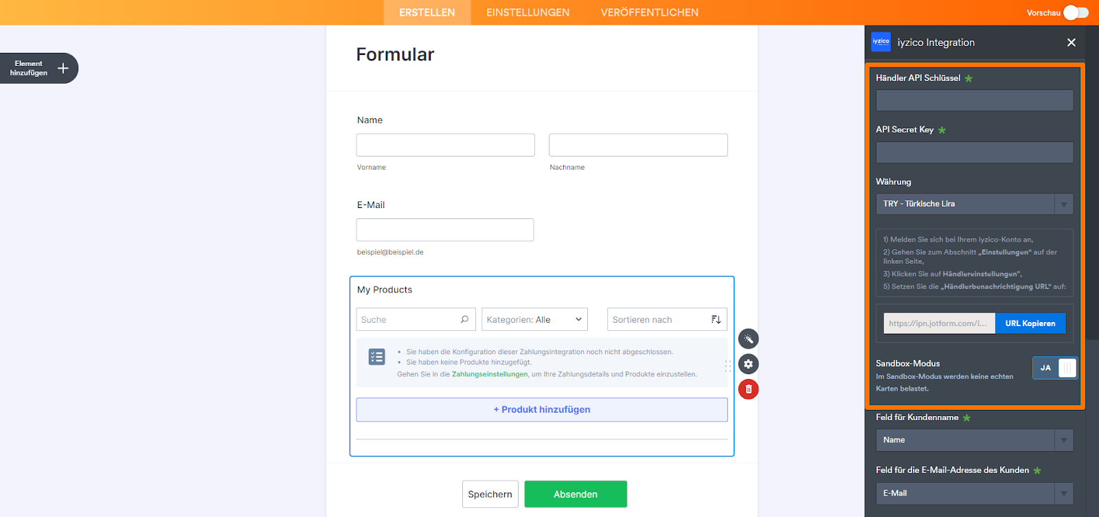 Hinzufügen und Einrichten von iyzico im Formular