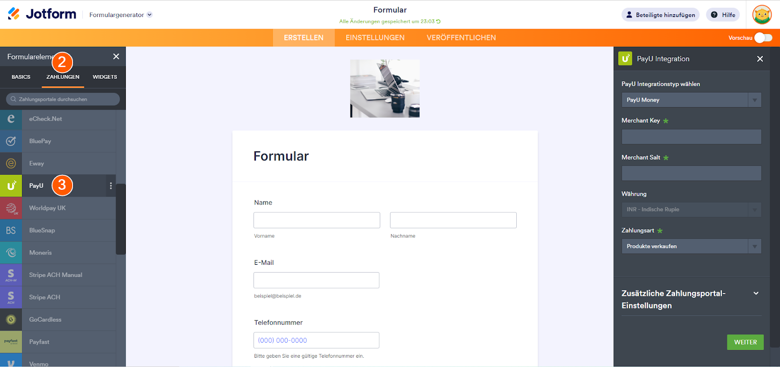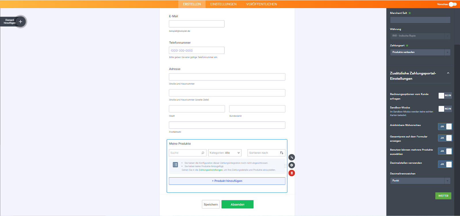 Wenn Sie ein Zahlungselement hinzufügen, werden in der Regel dessen Einstellungen geöffnet. Sie können es öffnen und PayU Money einstellen, indem Sie die folgenden Schritte ausführen: