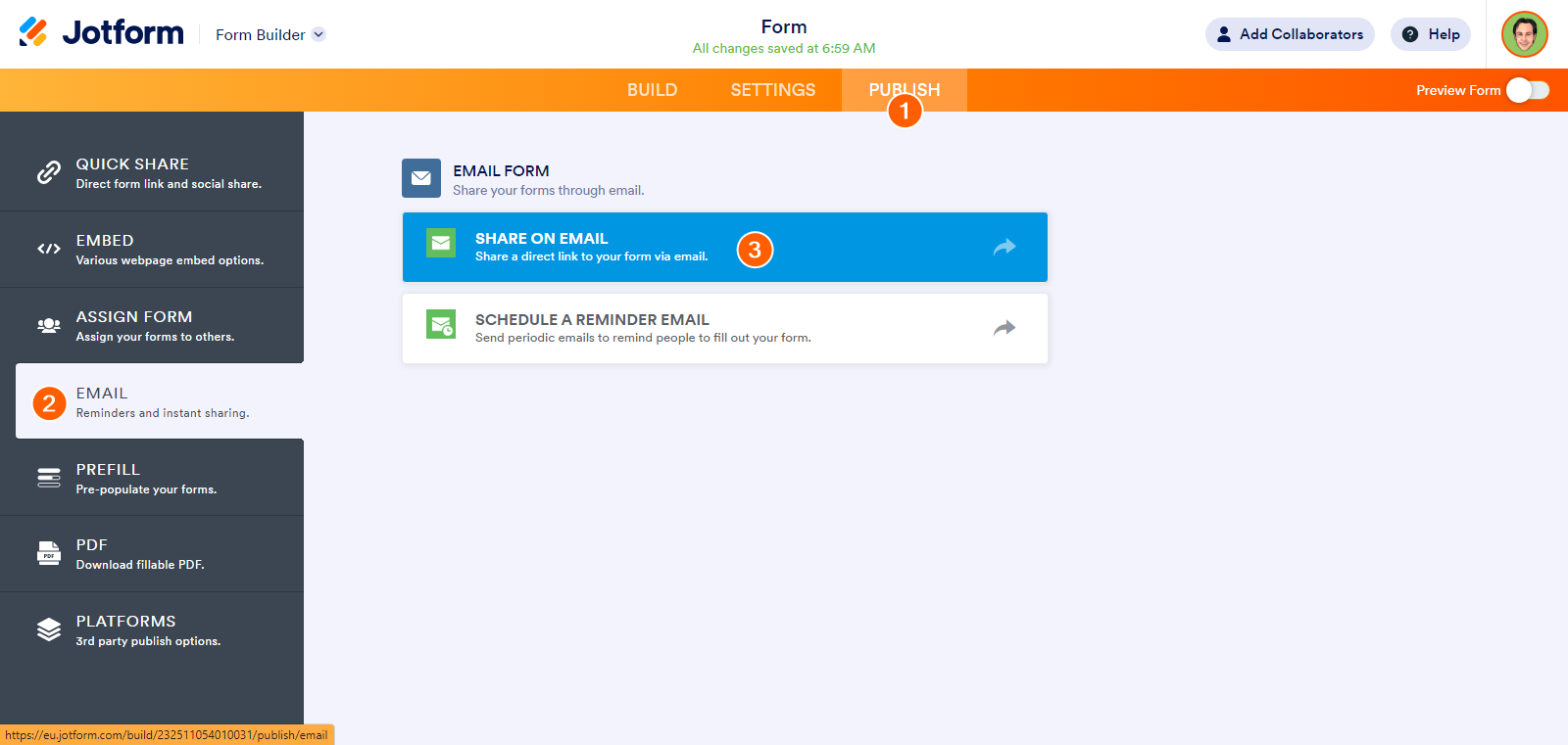 - Klicken Sie nun im Formular Generator in der orangefarbenen Navigationsleiste oben auf der Seite auf Veröffentlichen.