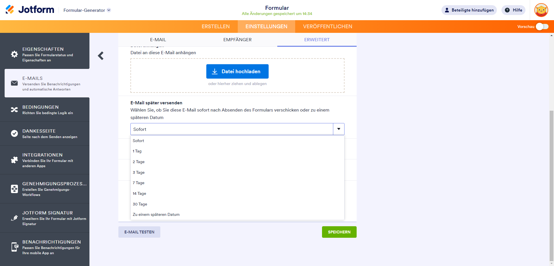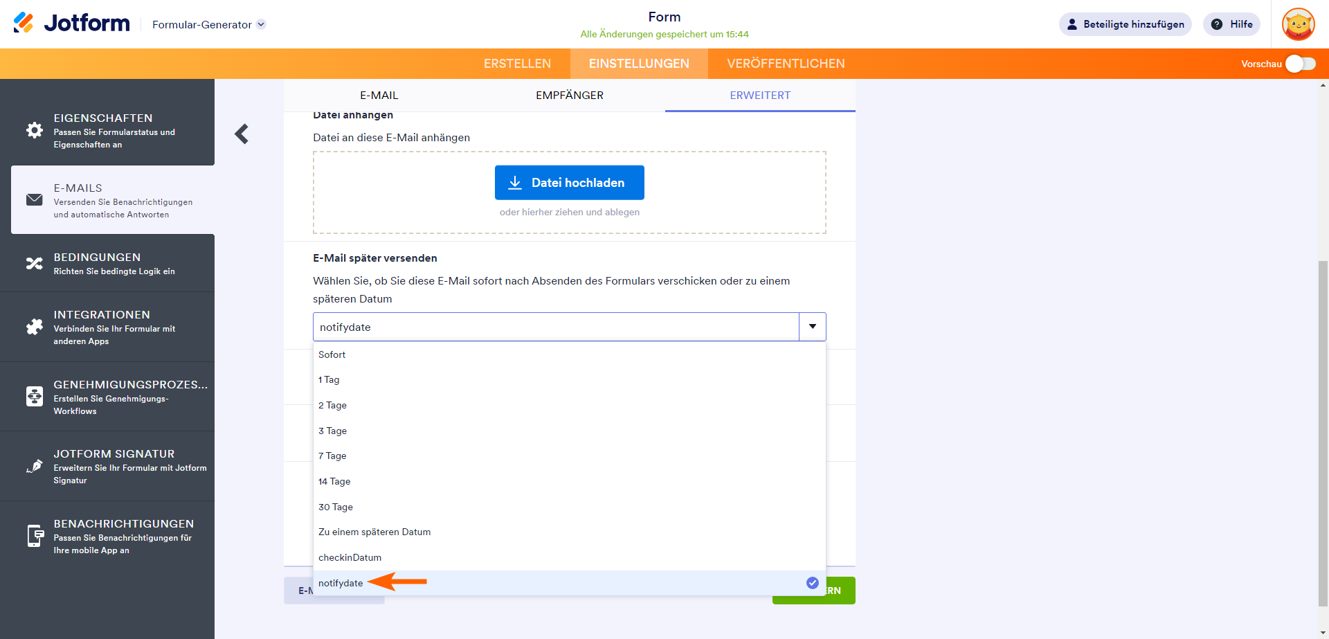 Mit der Funktion „E-Mails später senden“ von Jotform können Sie E-Mails zu einem späteren Zeitpunkt versenden. Dies ist nützlich, wenn Sie Formularteilnehmer bedingt benachrichtigen möchten. Senden Sie beispielsweise nach der ersten Einreichung eine Folge-E-Mail oder eine E-Mail basierend auf einem im Formular eingetragenen Datum.
