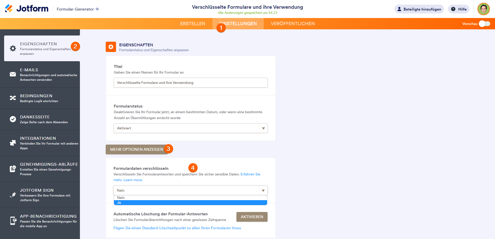 - Suchen Sie nach Formulardaten verschlüsseln und aktivieren Sie die Option Ja