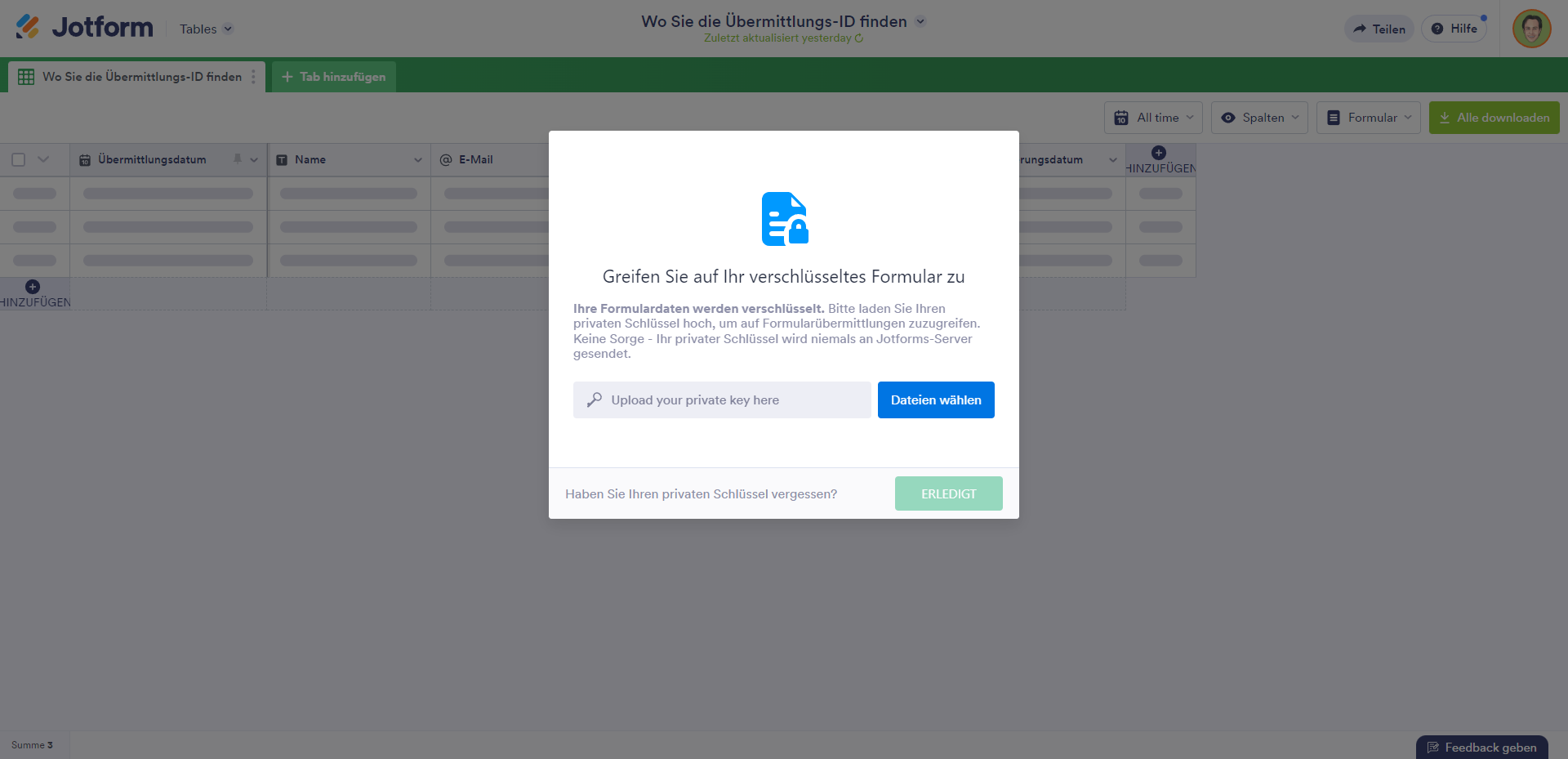 Sie können Ihr Formular über Jotform Tabellen und Jotform Posteingang entschlüsseln. Dies ist nur einmal erforderlich, es sei denn, Sie greifen mit einem neuen Browser auf Ihre Daten zu. Zum Entschlüsseln.