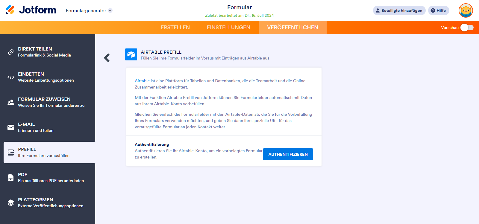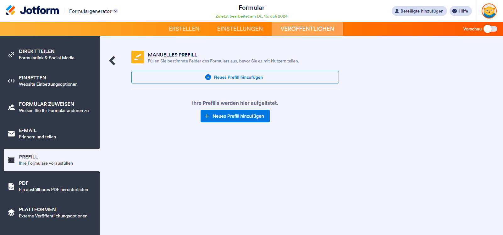 Sie können auf Prefill im Formular Generator zugreifen, indem Sie auf die Registerkarte Veröffentlichen gehen und Prefill auf der linken Seite auswählen.