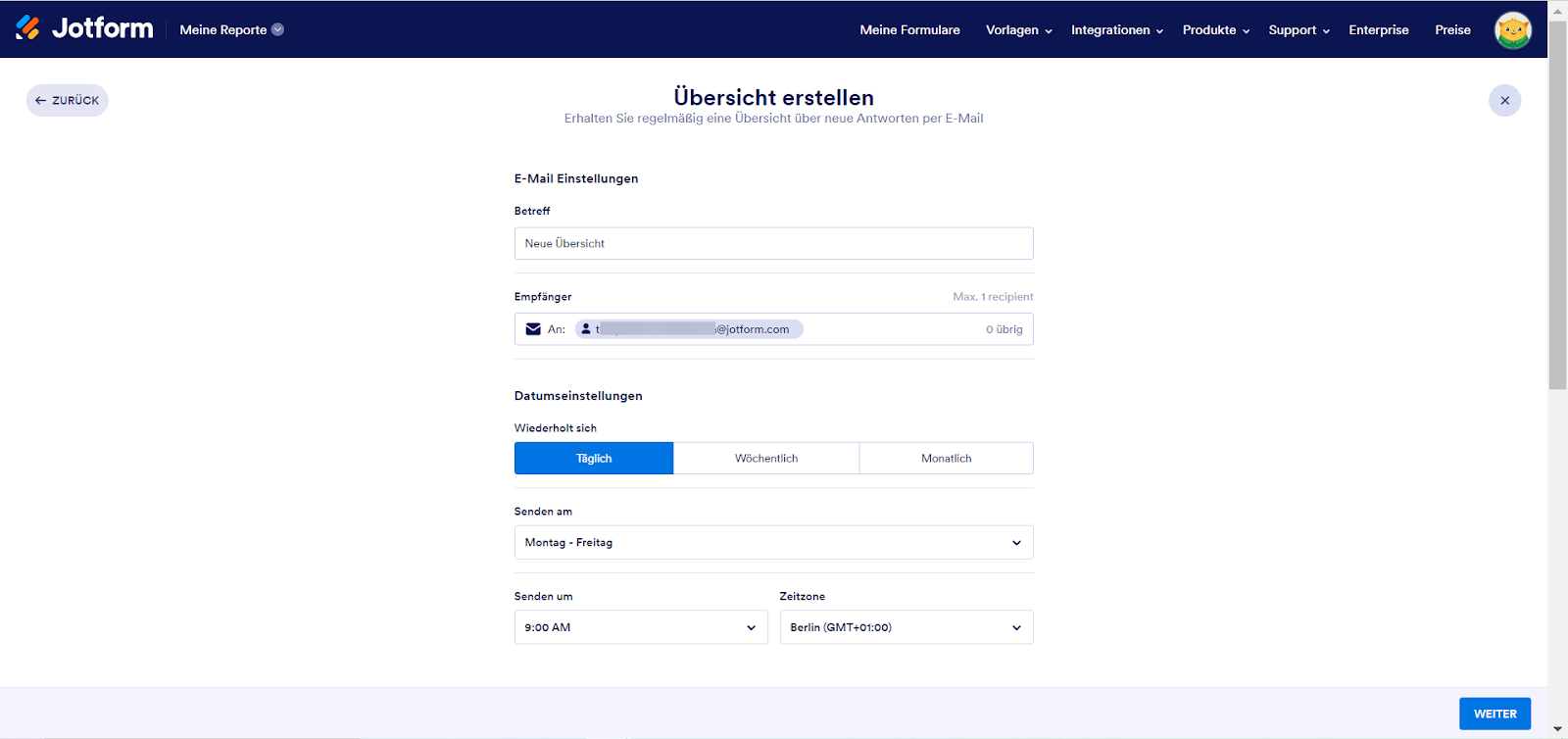 5. Nachdem Sie alles nach Ihren Vorstellungen eingerichtet haben, klicken Sie auf Übersicht erstellen. In einem weiteren Fenster werden Ihre Empfänger, Formulare und die Häufigkeit der E-Mails bestätigt. Wenn alles korrekt eingestellt ist, klicken Sie ein weiteres Mal auf Übersicht erstellen. Danach sind Sie schon fertig!