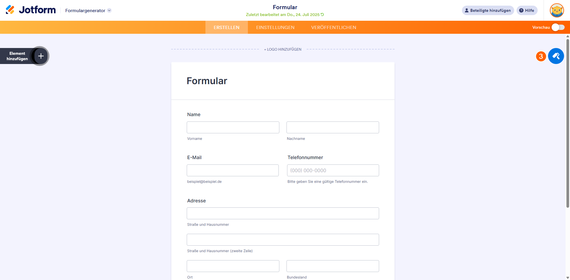 - Klicken Sie im Formular Generator oben rechts auf das Farbroller-Symbol, um den Formular-Designer zu öffnen.