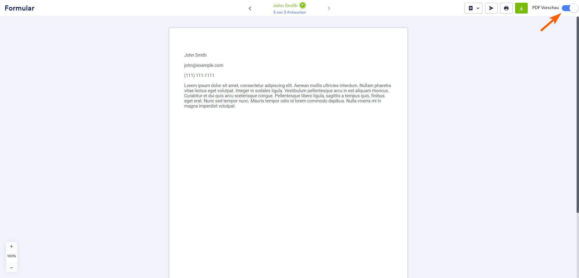 Sie können die PDF-Vorschau aktivieren, um das endgültige Aussehen Ihres PDF-Dokuments mit den ausgefüllten Feldwerten im Textfeld anzuzeigen. Sie können Ihr PDF-Dokument drucken, herunterladen oder mit anderen teilen. Hier ist ein Beispiel: