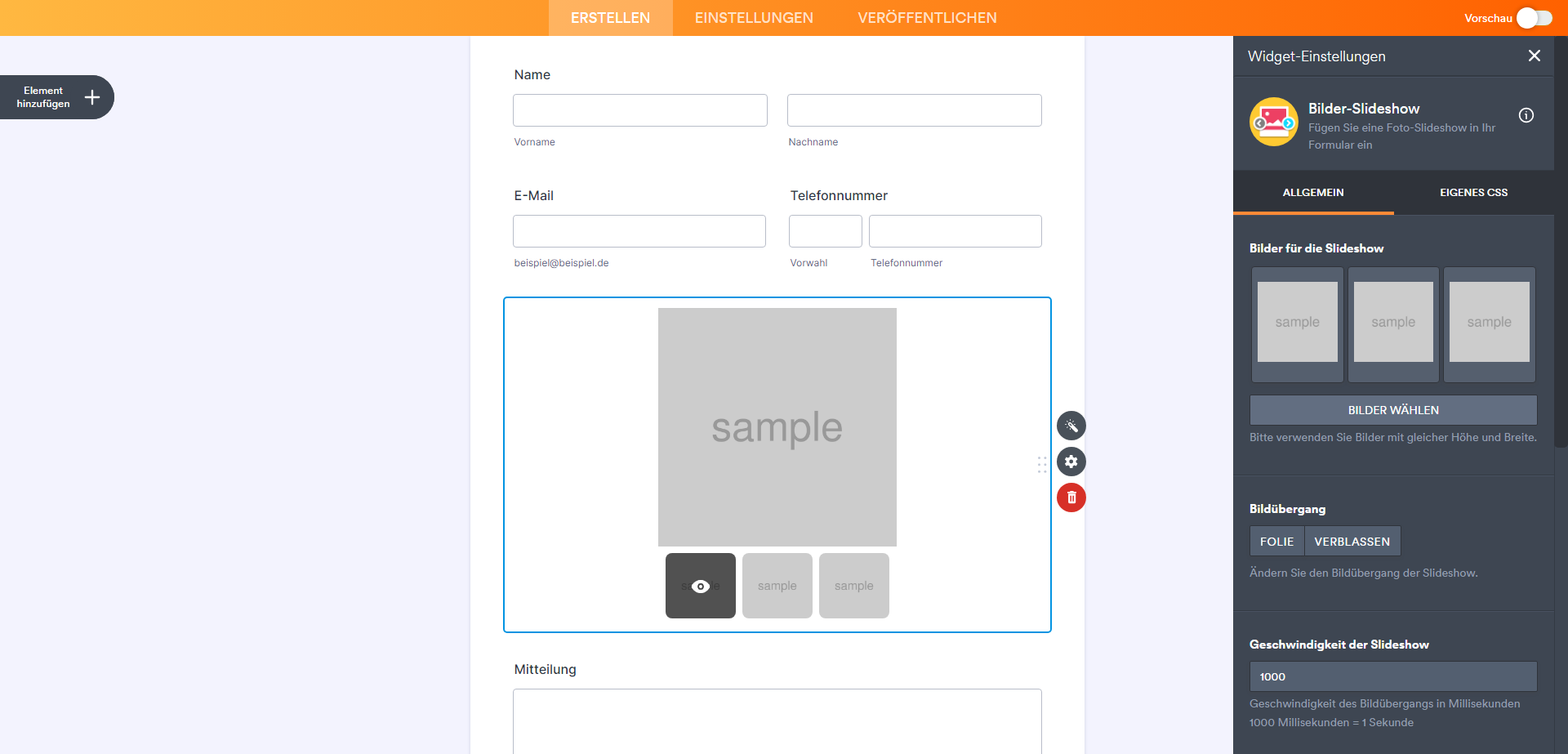 Der Das Image-Slider-Widget zeigt Ihre Bilder in einer rotierenden Diashow an. Dies ist nützlich, um Vorher-Nachher-Fotos, Arbeitsschritte oder beliebige Bilderserien hervorzuheben, die platzsparend und per Wischgeste angezeigt werden sollen.