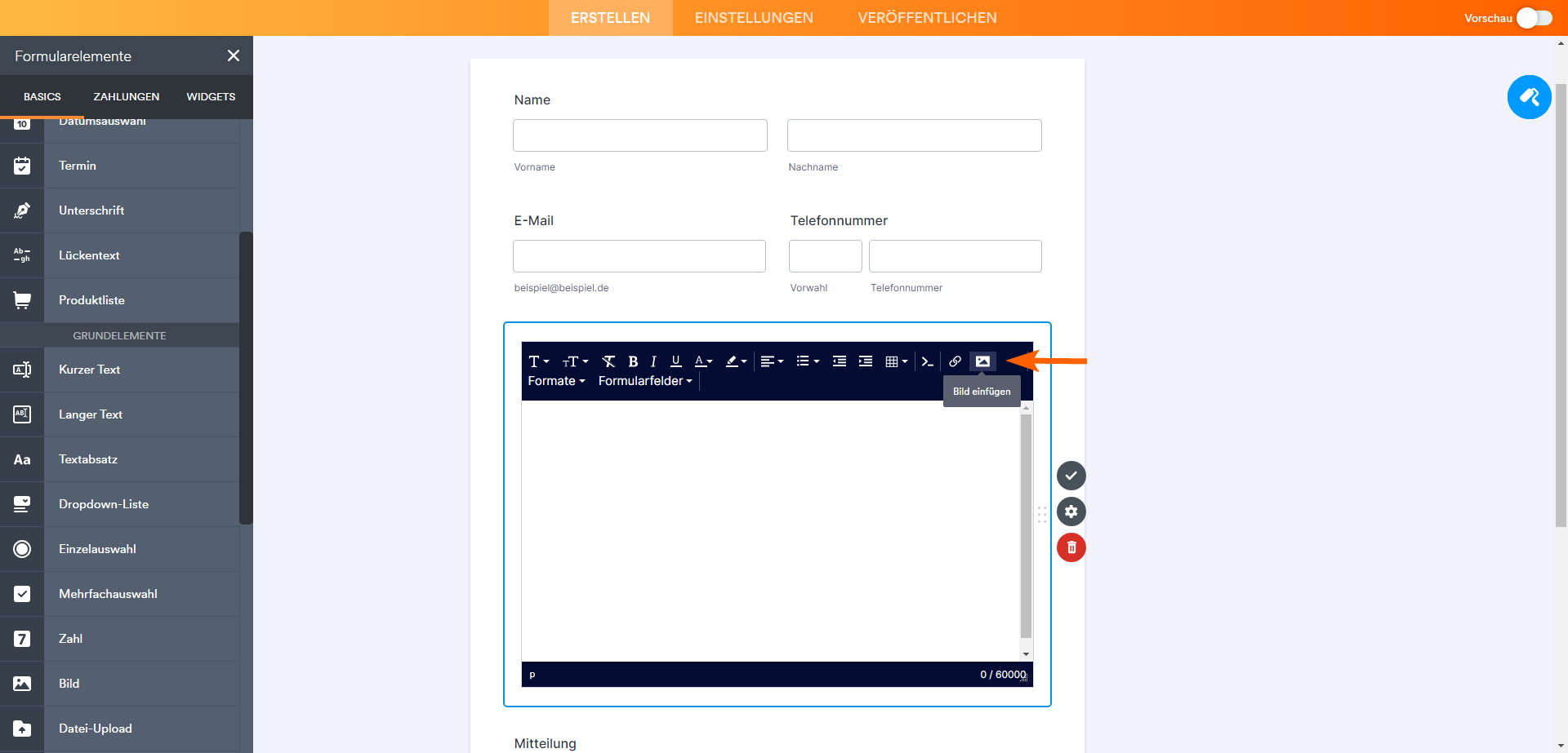 Mit dem Absatz-Element können Sie formatierten Text in Ihr Formular einfügen und auch Bilder einbetten. Es ist nützlich, wenn Sie visuelle Elemente mit Anleitungen, Beschreibungen oder anderen unterstützenden Inhalten kombinieren möchten.
