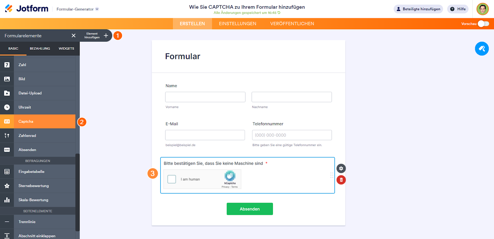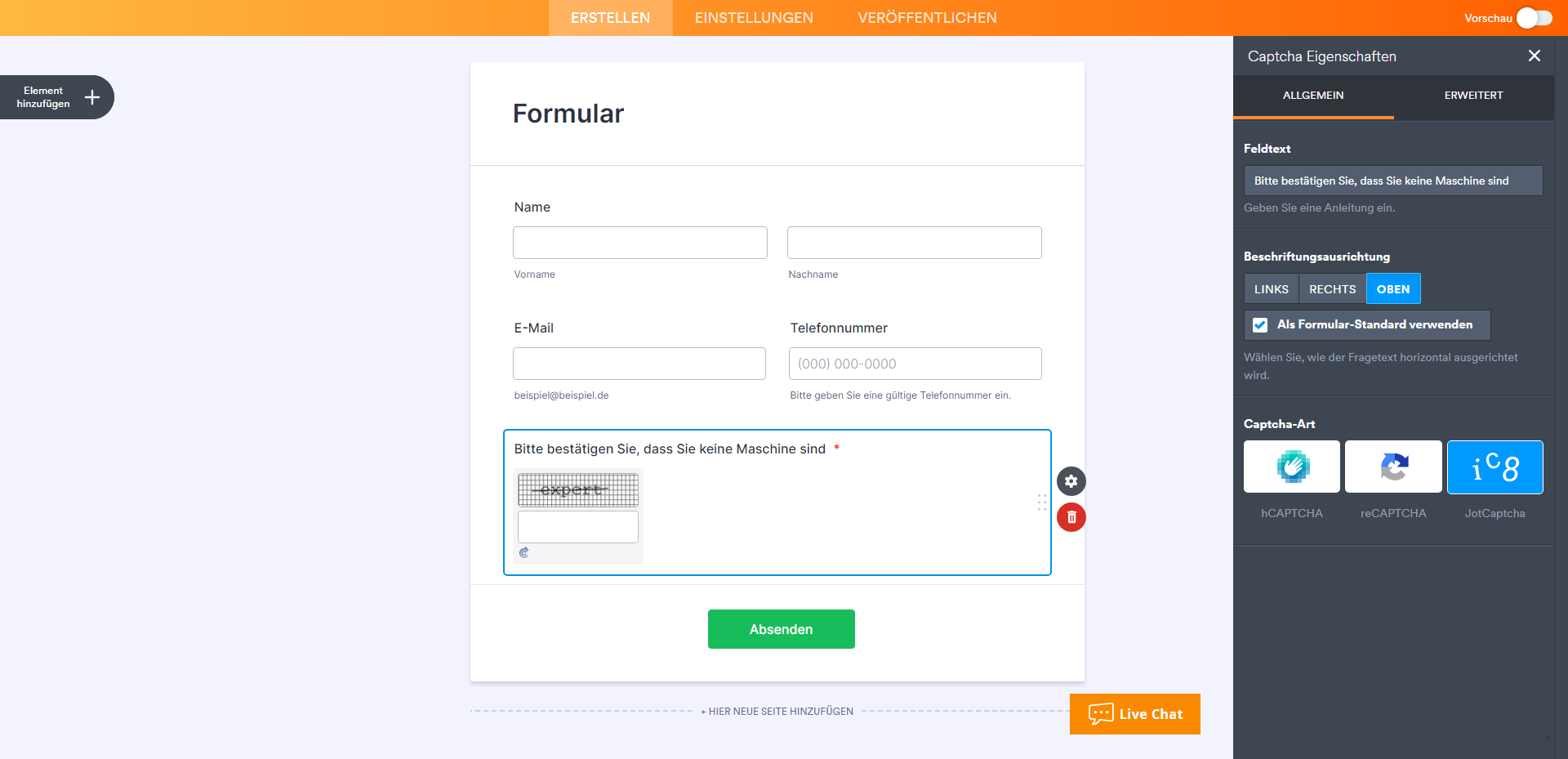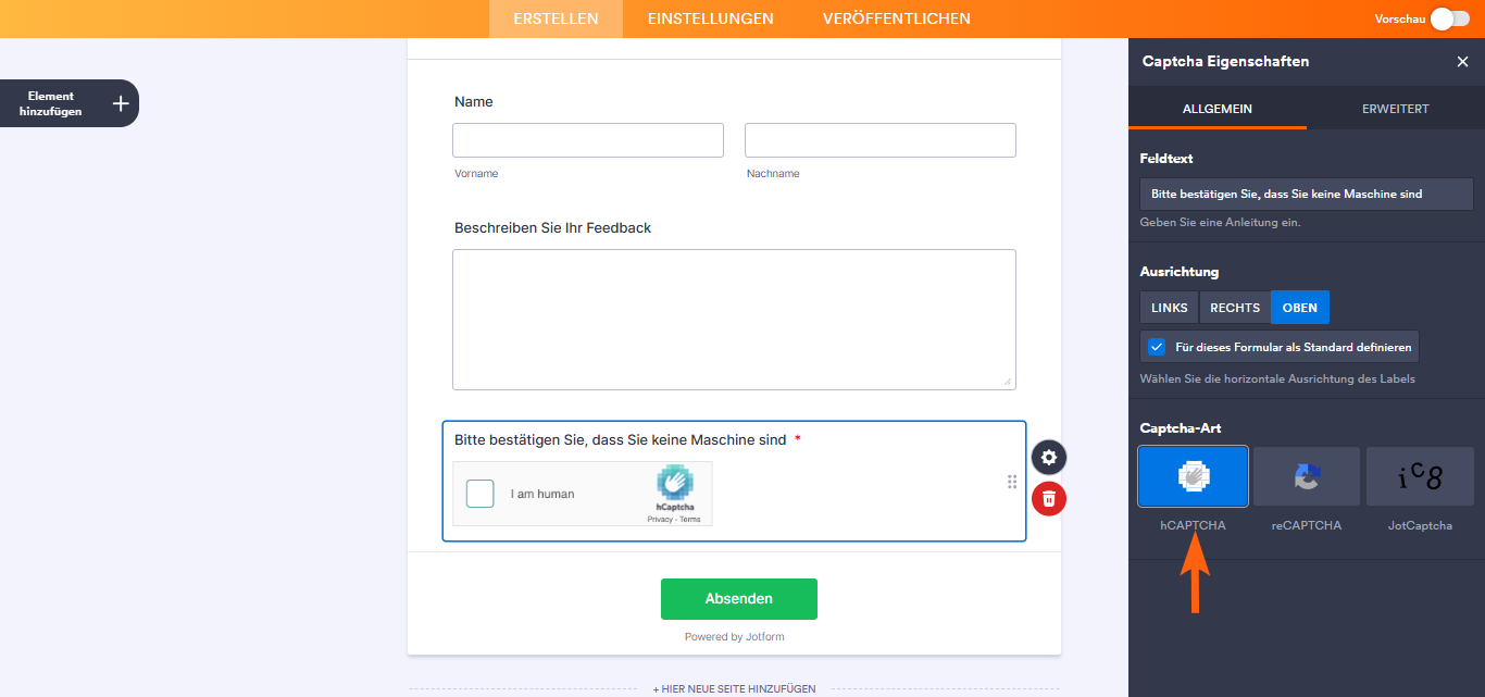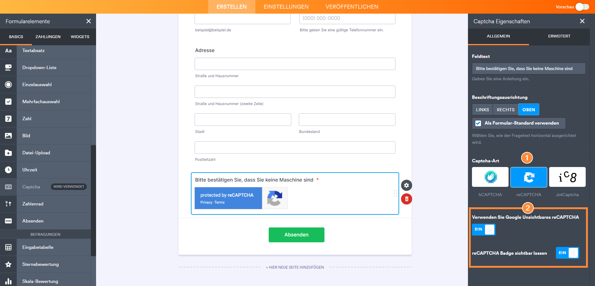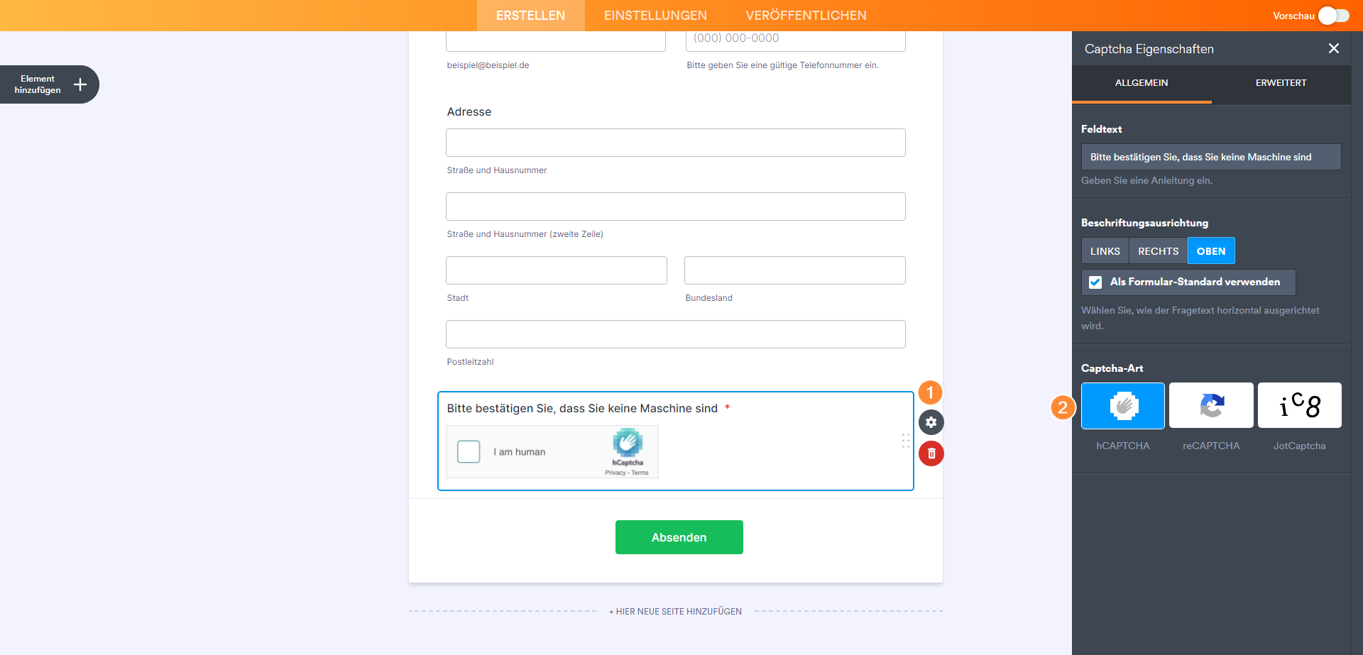 - Wenn Sie Ihrem Formular ein CAPTCHA hinzufügen, wird dieses automatisch auf Erforderlich gesetzt, um eine korrekte Validierung zu gewährleisten.