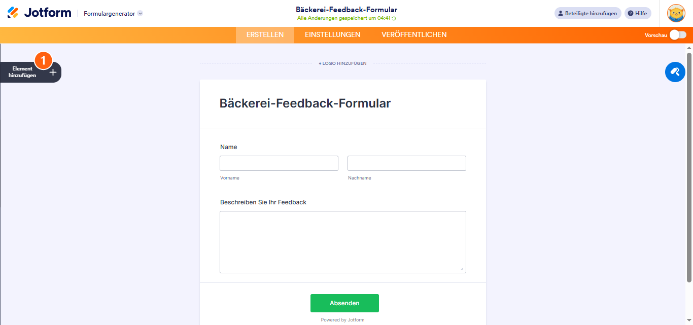 - Klicken Sie im Formular Generator links auf Element hinzufügen.