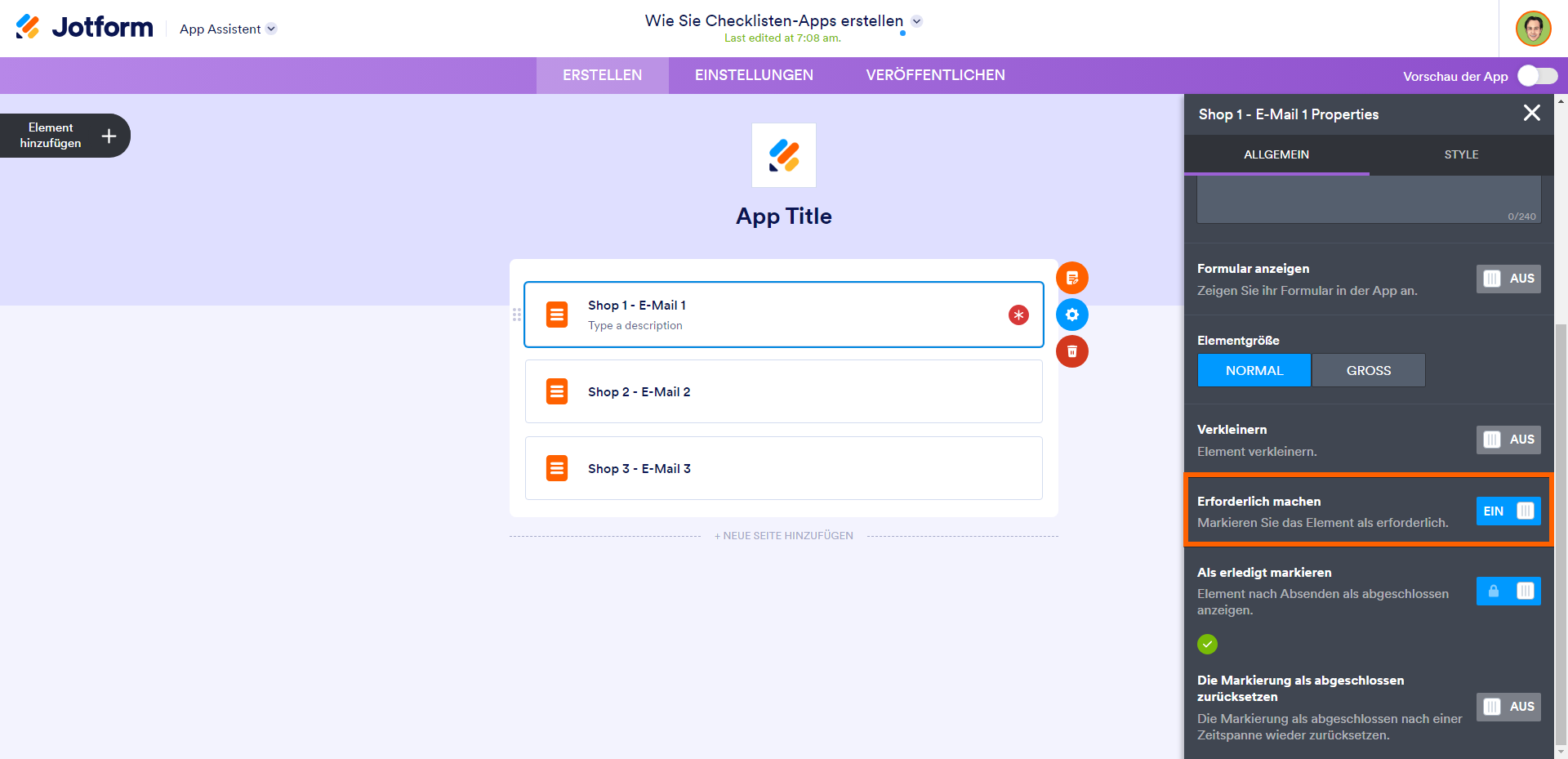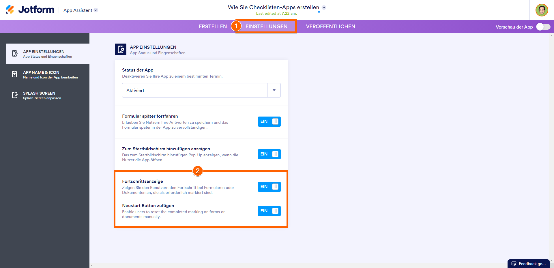 Wenn Sie Als erforderlich markieren aktivieren, wird im Reiter Einstellungen auch die Option Fortschrittsbalken hinzugefügt. Wenn Sie den Fortschrittsbalken aktivieren, wird die Option Neustart-Schaltfläche hinzufügen angezeigt, mit der Ihre Nutzer Ihre Checklisten-App manuell zurücksetzen können.