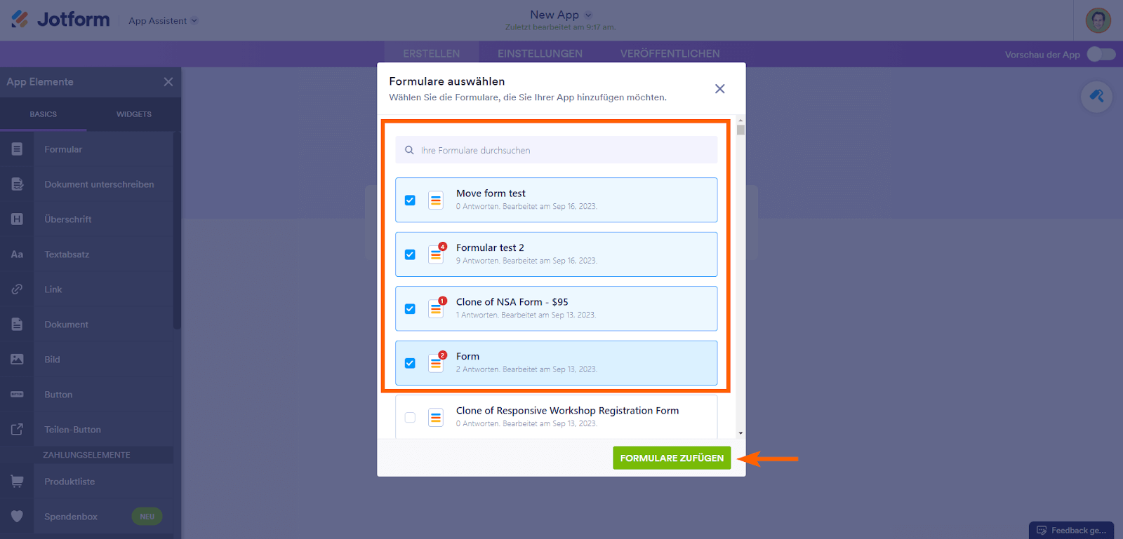 - Wählen Sie die Formulare aus, die Sie in Ihrer Checklisten-App verwenden möchten, und klicken Sie anschließend auf Formulare hinzufügen.