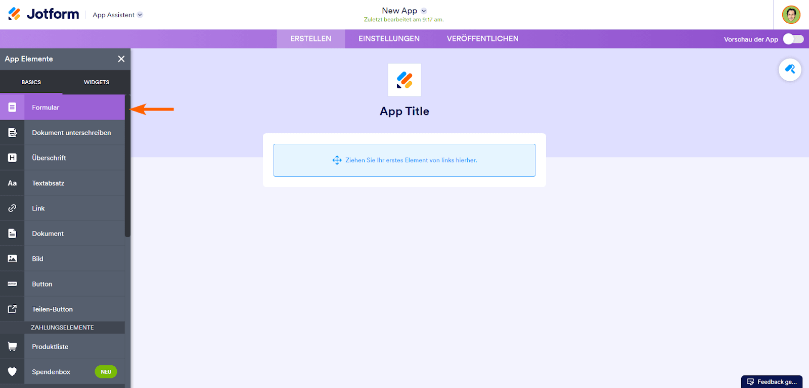 - Fügen Sie im App Generator Ihrer App ein Formular-Element hinzu. Weitere Informationen finden Sie unter App-Elemente hinzufügen.
