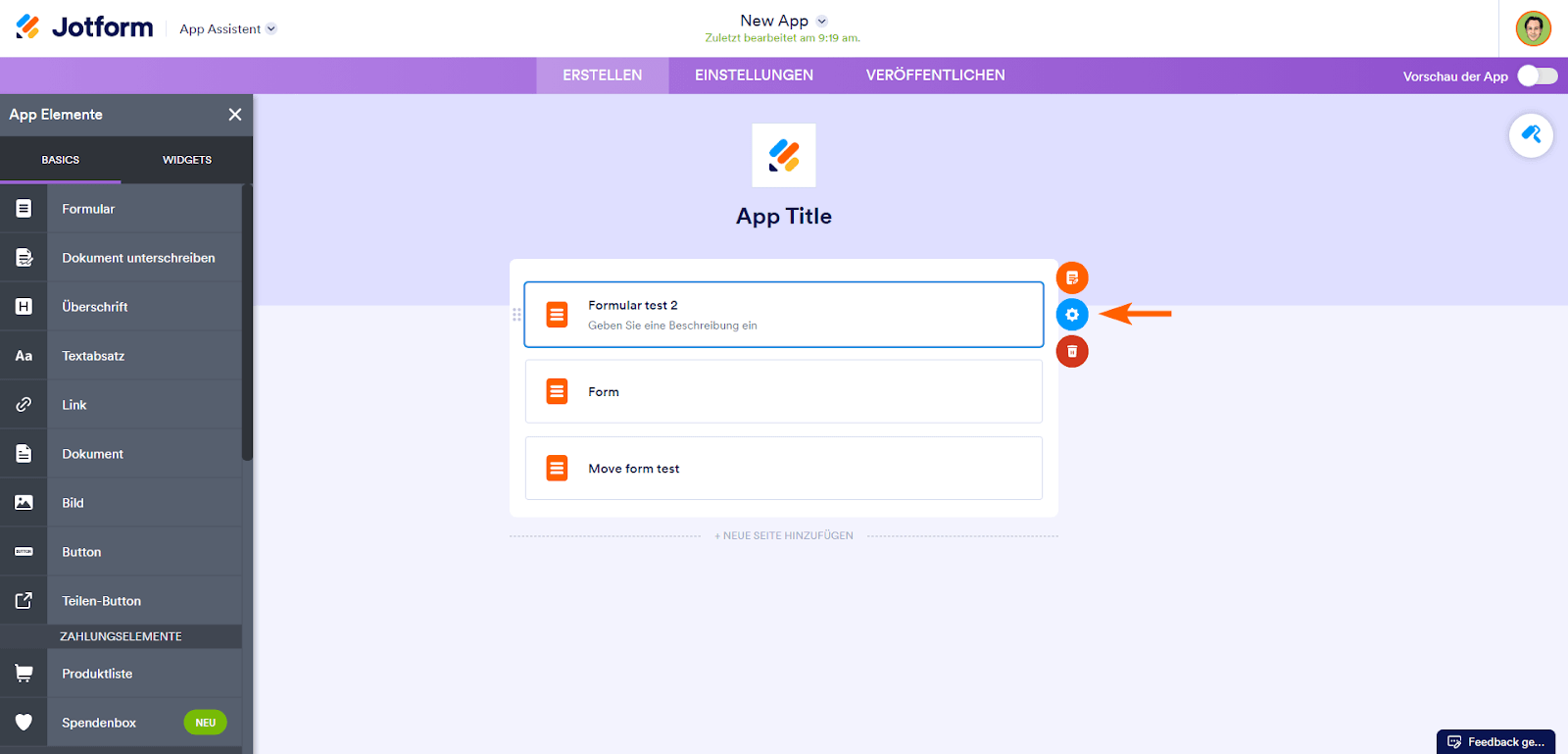 - Um ein Formular zu konfigurieren, wählen Sie dessen Zahnradsymbol aus, um die Eigenschaften anzuzeigen.