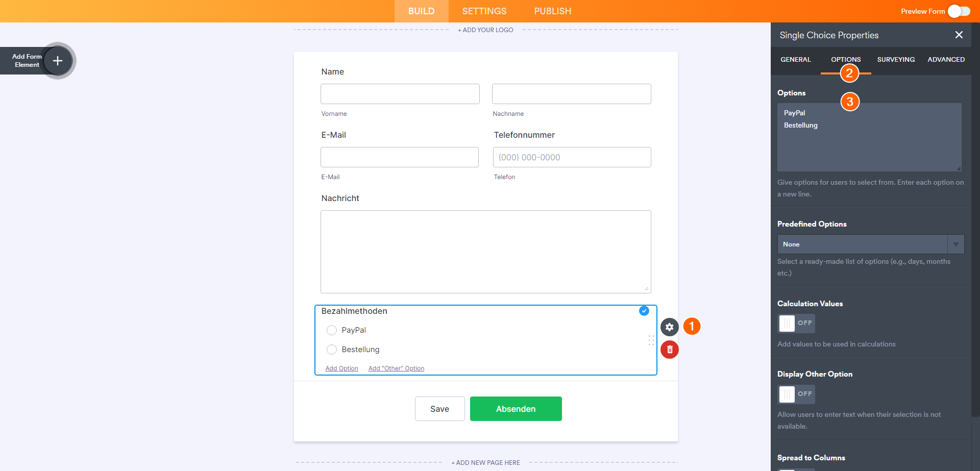 - Gehen Sie im Formular-Generator auf die Registerkarte Optionen des Feldes Zahlungsmethode, wenn Sie die Zahlungsmethode ändern oder eine weitere hinzufügen möchten.