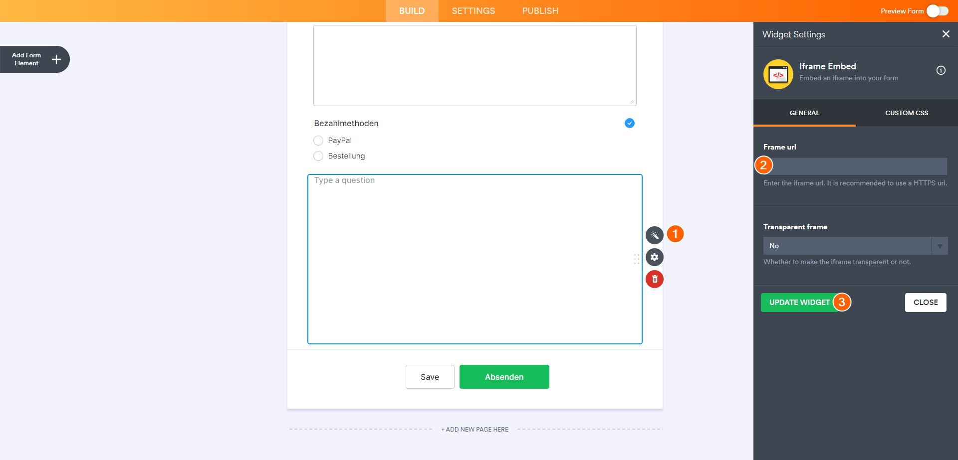 - Um das eingebettete Zahlungsformular zu ändern, öffnen Sie das Einstellungsfenster des Widgets IFrame Embed, indem Sie auf das Zeichen klicken, und aktualisieren Sie dann die Frame-URL.