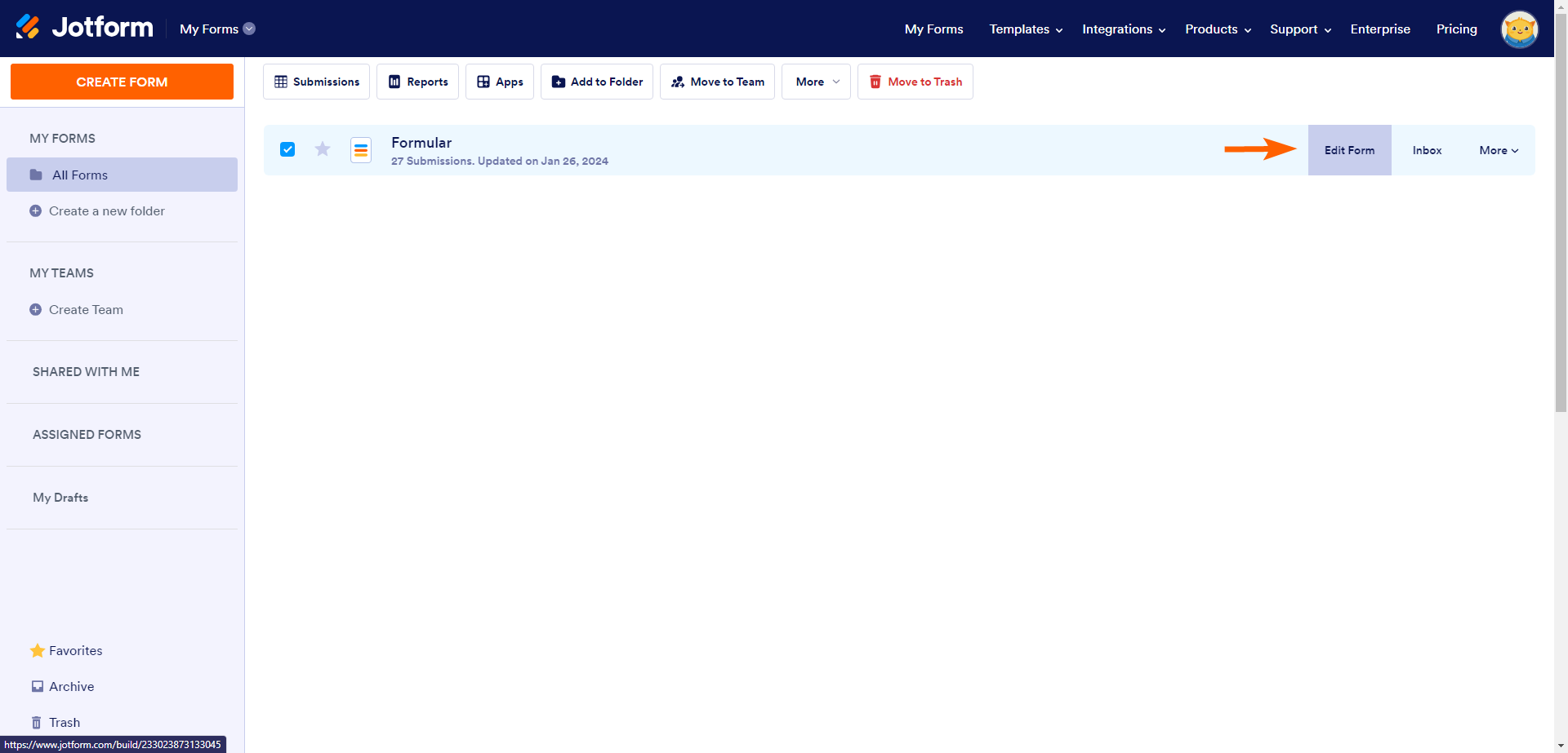 - Gehen Sie zu Meine Formulare und suchen Sie nach dem Basisformular, das Ihre Zahlungsformulare enthält. Klicken Sie auf die Option Bearbeiten, um das Formular zu ändern.