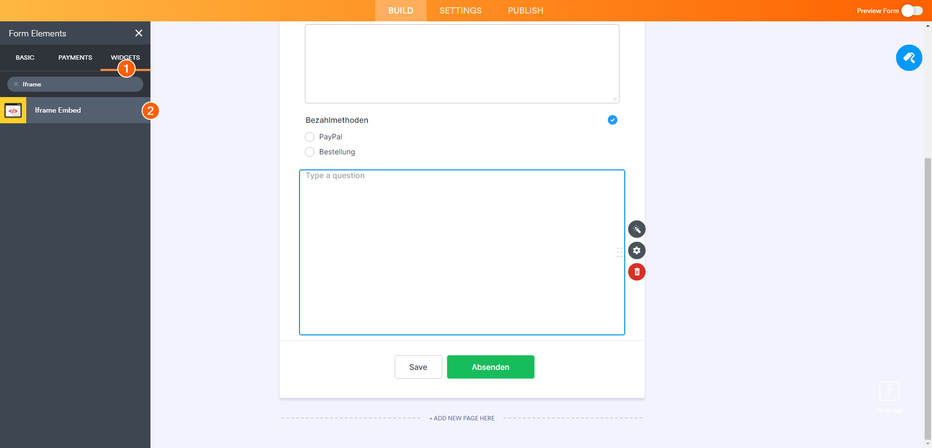 Um ein neues Zahlungsformular einzubetten, verwenden Sie ein neues IFrame Embed Widget. Ziehen Sie es per Drag & Drop auf den Formular-Generator und konfigurieren Sie die Einstellungen.