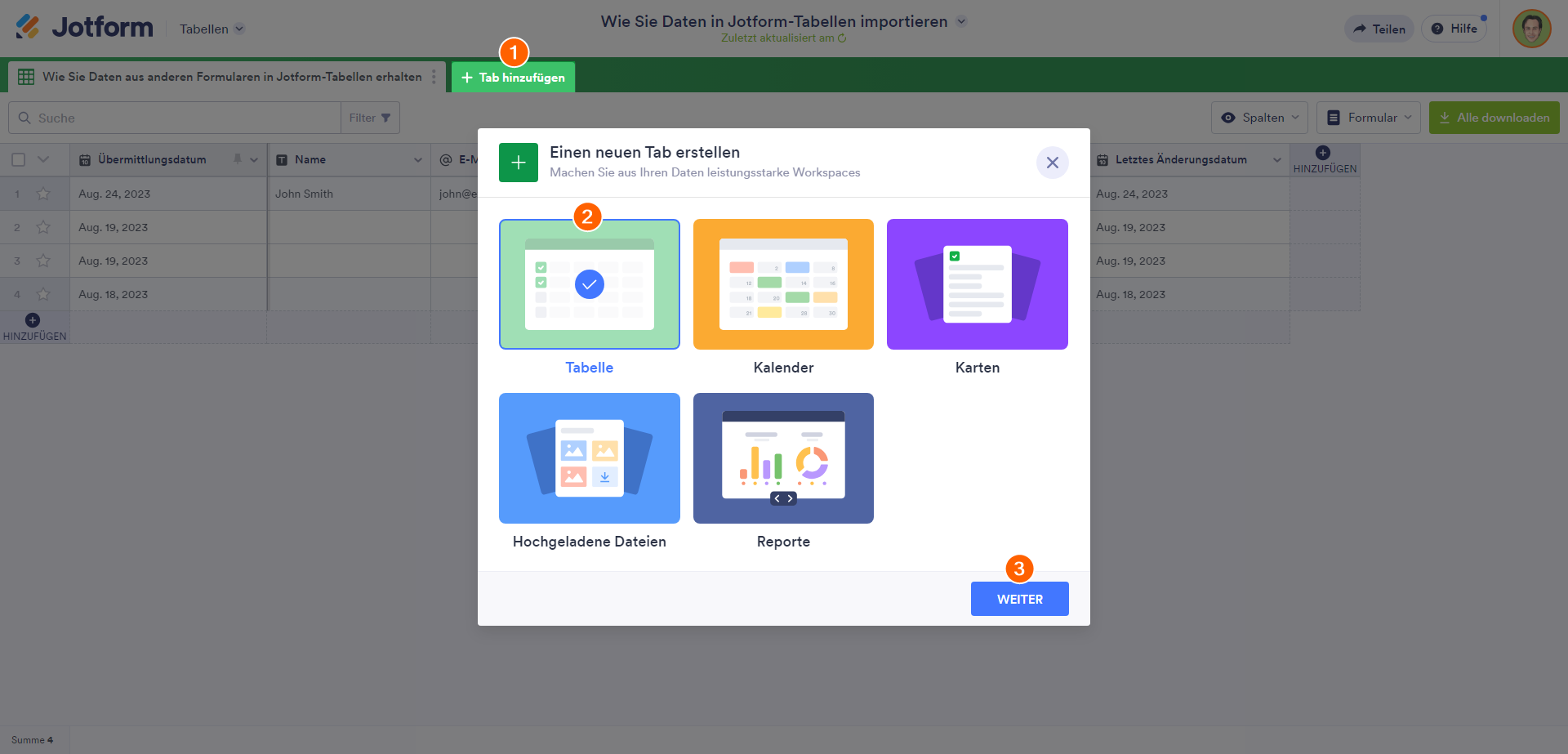 - Fügen Sie in Jotform Tabellen einen neuen Tab hinzu.