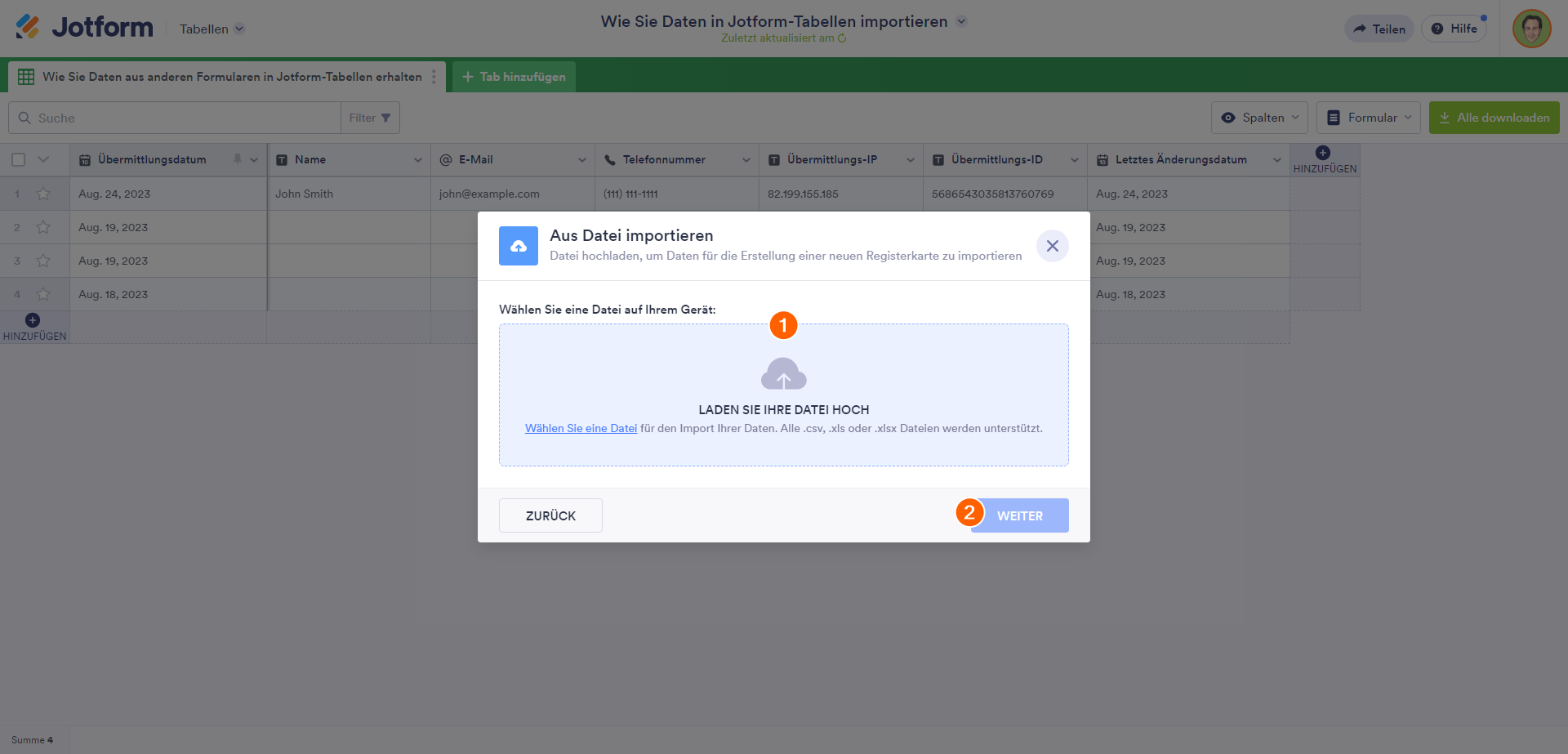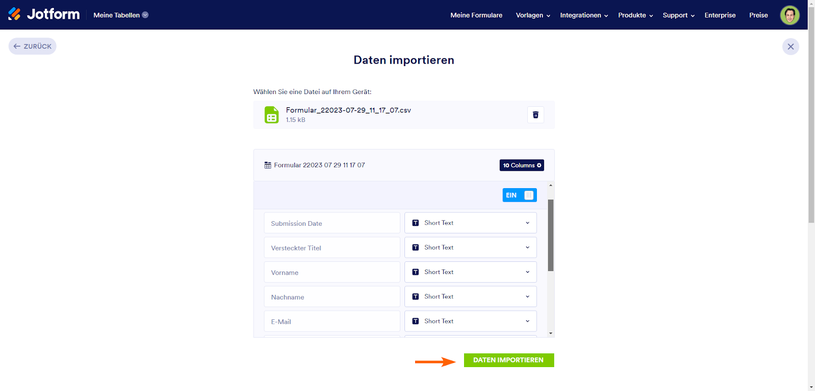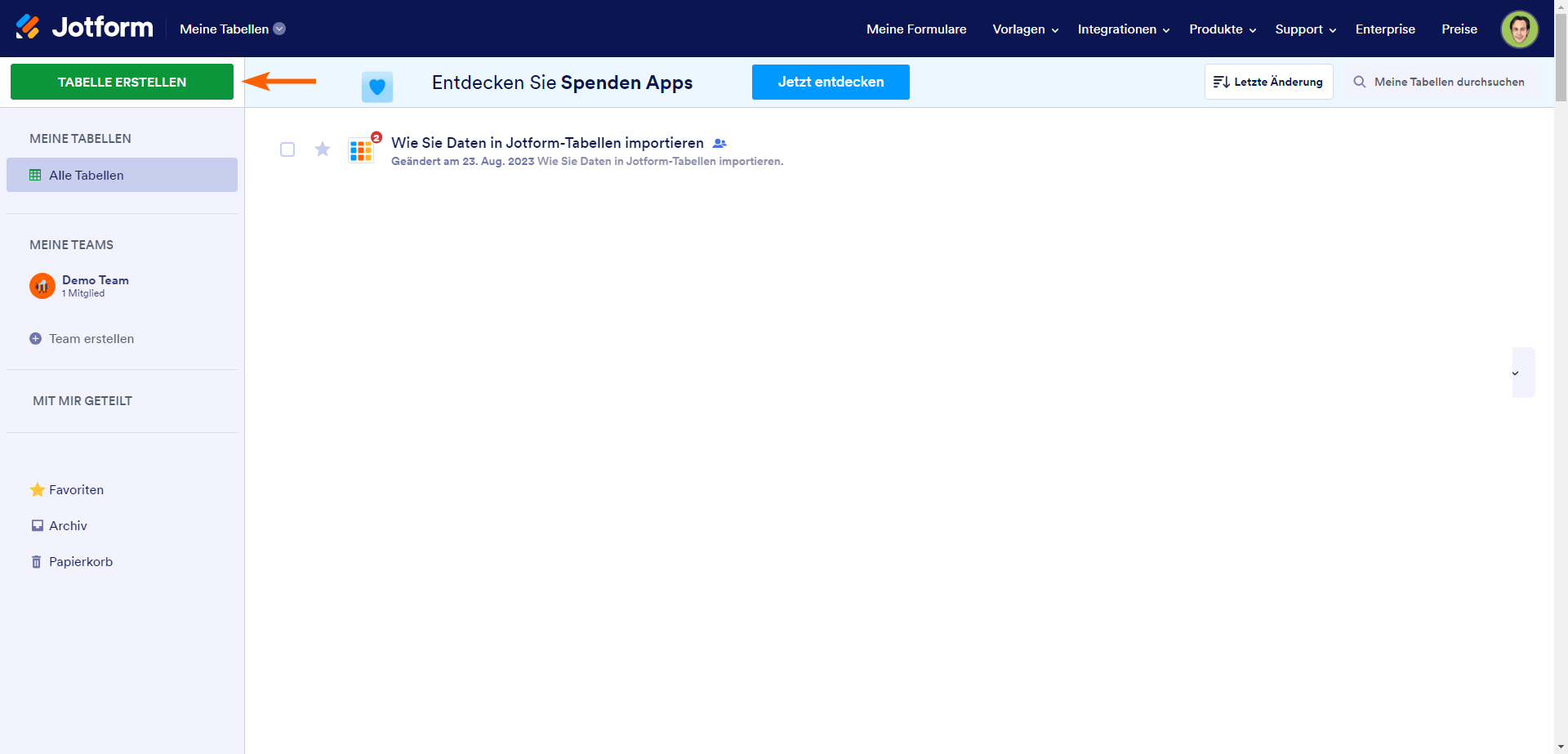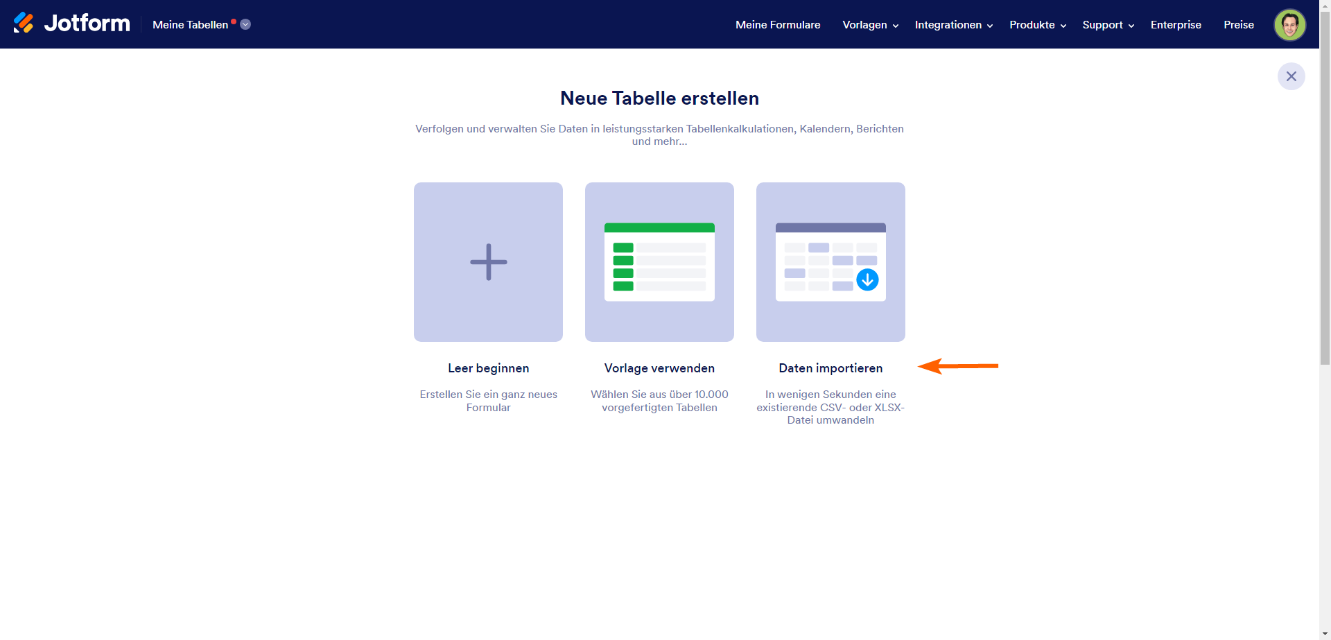 Jotform Tabellen ist ein leistungsstarkes Tool zum Organisieren, Verwalten und Teilen von Daten. Sie können Ihre Daten nutzen, um komplexe Berechnungen durchzuführen, den Fortschritt von Aufgaben zu verfolgen, Visualisierungen zu erstellen, Ihre Daten zu analysieren, mit Ihrem Team zusammenzuarbeiten und Arbeitsabläufe zu organisieren. Jotform erleichtert Ihnen den Import und die Verwaltung von Daten in Tabellen. Sie können Ihre Daten in eine neue oder bestehende Tabelle importieren.